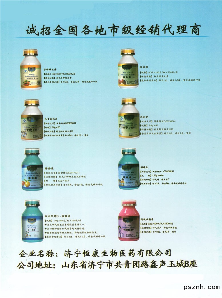 恒康生物醫(yī)藥現(xiàn)擁有多條現(xiàn)代化片劑、顆粒、粉劑、軟膠囊GMP認證生產(chǎn)線和多個國食健字批準(zhǔn)文號、SC等;公司根據(jù)市場需要研制生產(chǎn)的恒佳鈣D片(補鈣)系列、膳維欣(補鋅)系列、易雪康(補血)系列、膳倍康(維生素)系列、瑪咖(提高免疫力)系列、螺旋藻系列、泡騰片系列、蛋白質(zhì)、氨基酸、顆粒沖劑、軟膠囊等100多個系列產(chǎn)品,具有含量高、易吸收、價格低廉等特點,得到經(jīng)銷商和消費者的一致認可。