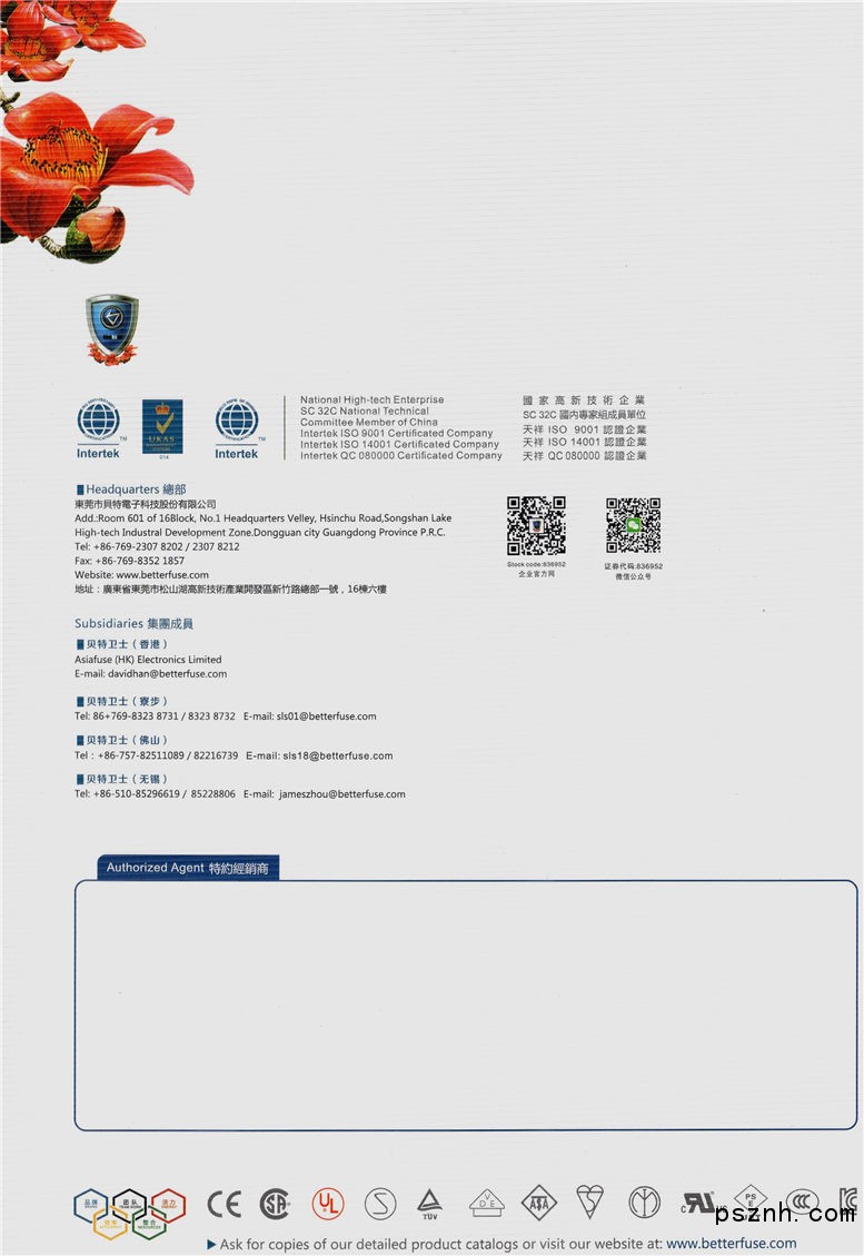 我們的產品包含過流,過壓,過溫電路保護原件以及相關配件,已經取得了UL, VDE, TUV, CCC, CQC, KC, PSE, ASTA等認證。