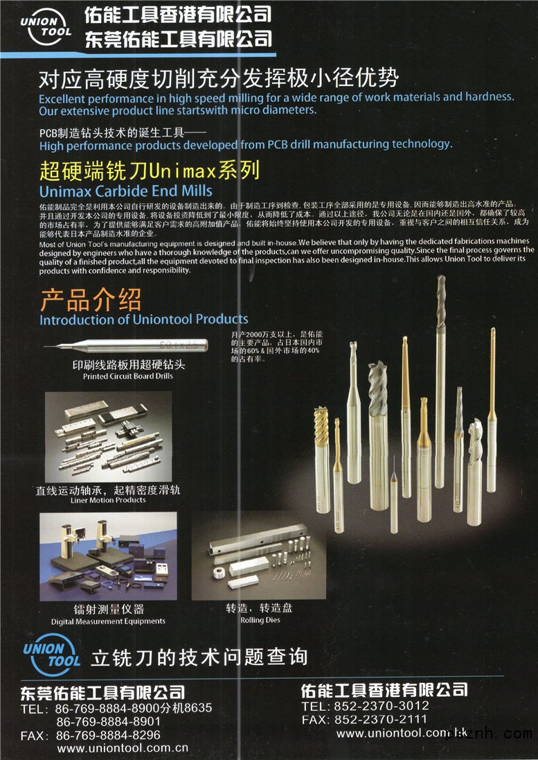 東莞佑能工具有限公司成立于2002年11月7日,是日本佑能株式會(huì)社在東莞洪梅鎮(zhèn)全額投資設(shè)立的海外分公司(日商獨(dú)資企業(yè)),集團(tuán)在日本、臺(tái)灣、上海、東莞設(shè)立制造基地及并在全球設(shè)有17所營(yíng)業(yè)所,是全球大的PCB超硬鉆頭、銑刀生產(chǎn)制造商;其生產(chǎn)、檢驗(yàn)、測(cè)量所使用的機(jī)械設(shè)備皆自行設(shè)計(jì)制造。