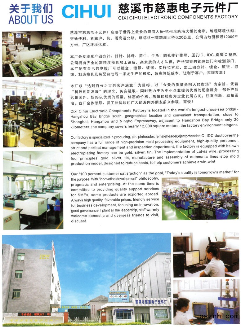慈溪慈惠電子元件廠創建于2002年,主要生產鍍金四方針,排針,排母,簡牛,牛角,IDC ,IC D-SUB,白色針座廣泛用于能電表LED顯示屏、LED照明、計算機、消費性電子及通訊設備等領域,公司設立自動PIN針車間,連接器裝配車間,注塑車間,電鍍車間(鍍金,鍍銀,鍍錫)公司已通過ISO9001:2008質量管理體系認證及ISO14001:2004環境體系認證,所生產產品已通過歐盟CE認證。通過不斷創新使產品更具競爭力。       公司所生每一個產品均符合歐盟RoHS環保指令要求,每年定期將所生產產品送往上海SGS測試機構進行測試,公司內部也擁有獨立的實驗室,能夠完成電氣、機械及環境性能的測試,儀器包括高低溫恒溫恒濕測試儀、全自動電腦控制拉拔力測試儀、顯微硬度測試儀、CCD影像測量儀、抗拉強度測試儀、溫升測試儀、老化實驗箱、鹽霧測試機、絕緣阻抗測試儀、接觸阻抗測試儀高壓測試儀、洛氏硬度測試儀、紅外線回流焊機、RoHS環保測試儀、電鍍膜厚X-RAY測試儀及震動測試儀等。