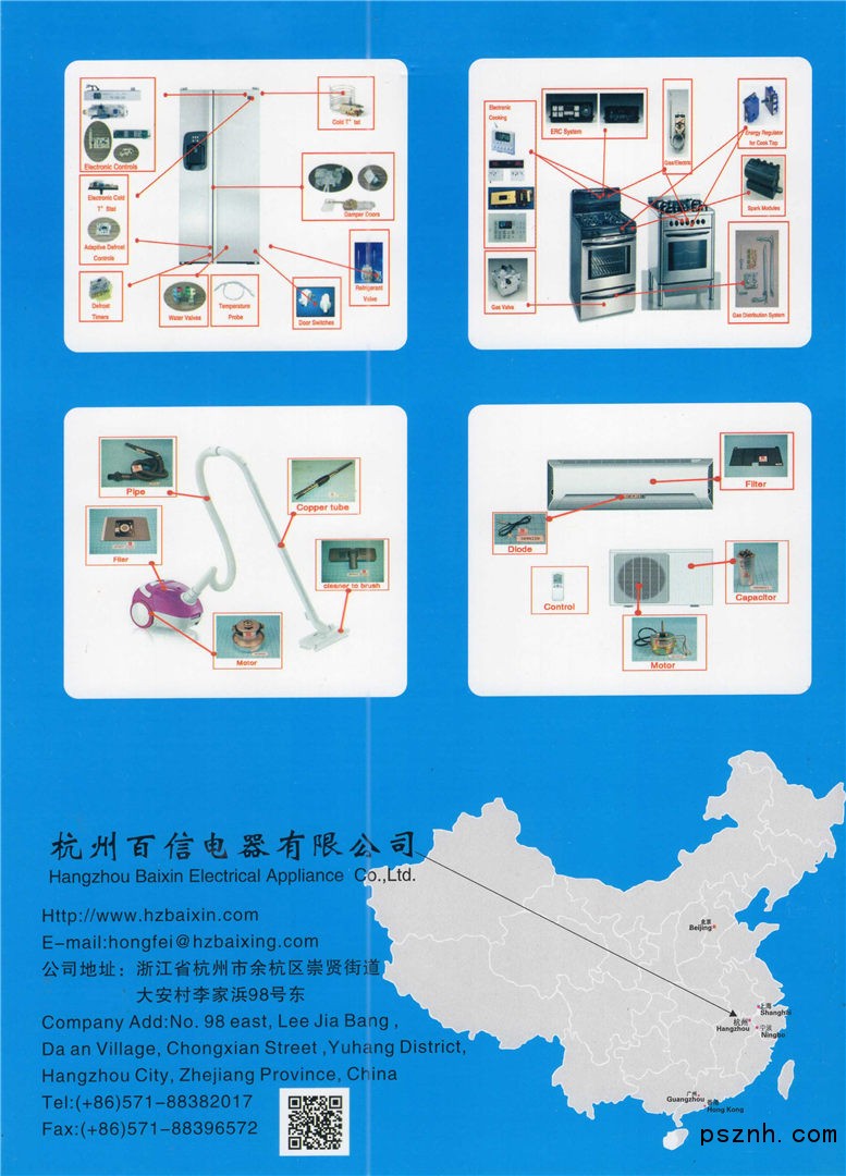 杭州百信電器有限公司自1990年開始銷售家用電器配件及來樣生產。包括:洗衣機、冰箱、空調、電視機、電飯鍋、微波爐、電風扇、吸塵器、飲水機、果汁機等幾十個品種,幾千個規格。公司位于杭州市下城區永佳西苑105號后面百信倉庫。   公司以質量第一,信譽至上,交貨及時、堅持薄利多銷,讓利客戶為原則,以客戶滿意為宗旨。愿與四方客商共同合作,共創未來!