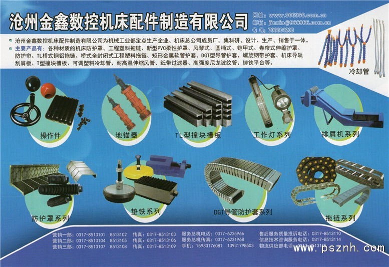 滄州金鑫數(shù)控機(jī)床配件制造有限公司為機(jī)械工業(yè)部定點(diǎn)生產(chǎn)企業(yè)、機(jī)床總公司成員廠,集科研、設(shè)計(jì)、生產(chǎn)、銷(xiāo)售于一體,是機(jī)床附件、防護(hù)裝置生產(chǎn)歷史較早、專(zhuān)業(yè)性強(qiáng)、技術(shù)力量雄厚,在國(guó)內(nèi)同行業(yè)規(guī)模較在的企業(yè)之一。我公司依靠科技開(kāi)發(fā)產(chǎn)品,使企業(yè)充滿活力,用戶(hù)遍布全國(guó)各地及國(guó)外,本公司產(chǎn)品保用一年,質(zhì)量三包,終身維修,免費(fèi)咨詢(xún)。我們致力于開(kāi)拓創(chuàng)新,不斷改造完善,為用戶(hù)提供最好,更新的現(xiàn)代化產(chǎn)品,并通過(guò)完善的產(chǎn)品服務(wù)來(lái)滿足您的愿望和要求。