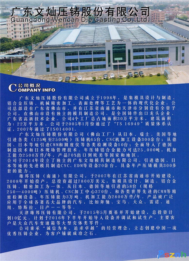 文燦股份于2015年3月份在北京的中國中小企業股份轉讓系統(俗稱新三板)正式掛牌成為公眾公司,股票代碼為832154. 公司擁有400多人組成的具有豐富經驗的優秀技術隊伍,配備了現代先進設計和管理的軟件及工具。現有壓鑄設備110多臺(噸位從125噸到4000噸)、加工中心700臺。 公司目前以汽車用鋁合金壓鑄件零件為主要產品,產品零件覆蓋:發動機、變速箱、轉向器、空調壓縮機、馬達電機、過濾系統、制動系統、各種泵、控制單元,以及車體結構件等等。客戶遍布全球20多個國家。整車客戶包括:奔馳汽車、大眾汽車VW、通用汽車GM、特斯拉汽車Tesla、沃爾沃汽車Volvo、奧迪汽車Audi、長城汽車等等;世界知名的一級零部件客戶包括:德國博世Bosch、德國蒂森克虜伯、德國馬勒Mahle、法國法雷奧VALEO、德國格特拉克Getrag、美國天合TRW、德國WABCO、日本JATCO、德國博澤Brose、德國采埃孚ZF、美國偉世通HVCC……等等。