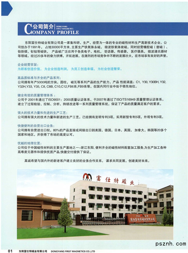 東陽富仕特磁業有限公司是一家中外合資本企業。成立于1990年,現有員工300名;企業已于2001年通過國際質量管理標準ISO9001:2000認證,2007年3月底前通過了專用于汽車方面的質量管理標準ISO/TS16949認證,連續多年被評為東陽市朝陽企業;連續多年成為東陽市超百萬納稅大戶。產品大部分出口,資信等級AAA級。 本公司主要生產出口磁鐵及磁性應用品,工廠擁有國內先進設備、雄厚的技術力量、高精度的檢測儀器,生產的高性能永磁鐵氧體被廣泛應用于家用電器、電機、汽車電子、自動化儀表等領域。年生產能力達3000噸,90%產品出口10多個國家和地區,并與歐美及日、韓等多家大公司建立了長期穩定的業務關系,公司產品已進入NOKIA、西門子、松下、羅杰斯和法拉利等全球著名公司。 現為浙江省高新技術企業,磁性材料省級高新技術特色基地成員,浙江省磁性材料產業協會高新技術研發基地。