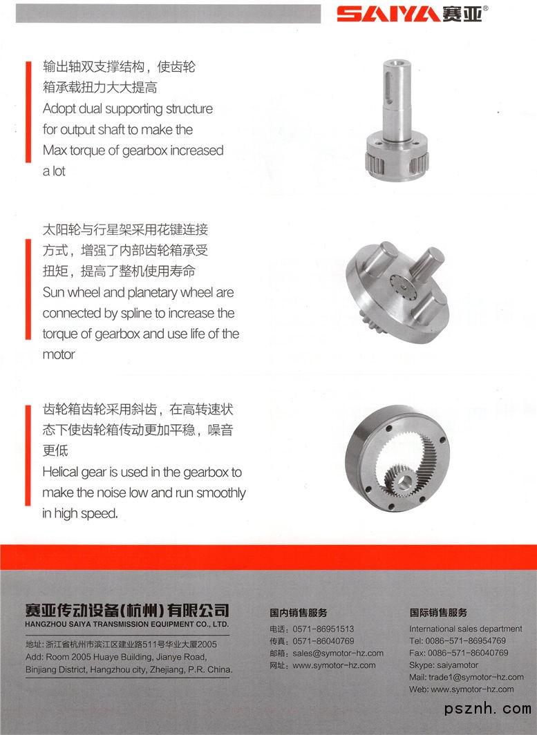 杭州賽亞傳動設備有限公司始創于2009年,位于杭州市江干區。是一家致力于生產微型交流、直流齒輪減速電機、小型減速電機、伺服專用行星減速機,直流有刷和無刷電機等產品的集生產和銷售為一體的公司。   公司生產的感應電機,可逆電機,力矩電機,小型減速電機,無刷直流電機,微型齒輪箱,硬齒面齒輪減速器,精密蝸桿,高精度行星齒輪減速器等產品都是我們的強項。產品具有壽命長、噪聲小、體積小、重量輕、免保養、價格低等特點。 公司生產的產品可替代傳統皮帶減速的電機、擺線針輪減速機,還可替代德國、日本、 韓國同類齒輪減速電機。公司產品廣泛應用于成套傳輸設備、自動化流水線、印刷包裝機械、紡織印染機械、木工家具械、橡膠塑料機械等一些輕功自動化行業。   杭州賽亞傳動設備有限公司實力雄厚,重信用、守合同、保證產品質量,以多品種經營特色和薄利多銷的原則,堅持“誠信-創新-互利-共贏”,贏得廣大客戶的信任。