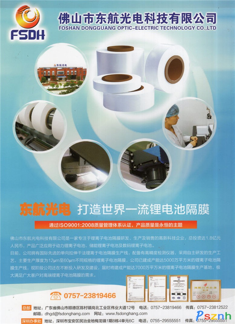 佛山市東航光電科技有限公司是一家專注于鋰離子電池隔膜研發、生產及銷售的高新科技企業,總投資達1.8 億元人民幣,產品廣泛應用于動力鋰離子電池、儲能鋰離子電池及數碼鋰離子電池中。