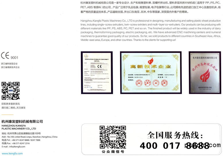 杭州康發塑料機械有限公司,是一家創建于70年代,有著三十多年機械經驗的公司,注冊資金為1050萬。公司坐落于國際花園城市杭州市郊,水陸空交通便利的錢塘江南岸——蕭山臨浦工業園區。本公司是一家專業生產和銷售塑料單、雙螺桿擠出機、塑料多層共擠片材機組的專業公司(使用PP、PS、PC、PET、ABS等原料),產品廣泛用于乳品包裝,吸塑包裝,電子包裝等行業。公司占地面積30畝,擁有先進的進口加工中心及數控機床 ,有著嚴格的質量監控體系。專業工程師時刻在生產第一線,結合高科技手段利用機械三維軟件輔助設計對產品進行實時監督。