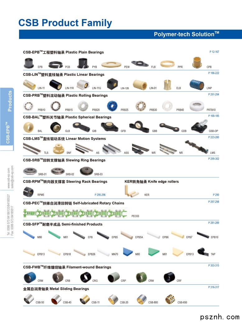 浙江長盛塑料軸承技術(shù)有限公司是中國專業(yè)的免維護自潤滑材料、軸承研究開發(fā)制造商。CSB憑借多年來對自潤滑材料科學(xué)的關(guān)注與研究開發(fā)出四大系列產(chǎn)品:金屬復(fù)合基滑動軸承、金屬基滑動軸承、塑料滑動軸承、纖維纏繞軸承。本網(wǎng)站詳細介紹的是CSB旗下分公司浙江長盛塑料軸承技術(shù)有限公司生產(chǎn)的工程塑料軸承、塑料直線軸承、塑料關(guān)節(jié)軸承、纖維纏繞軸承以及直線導(dǎo)軌模組的技術(shù)特性和應(yīng)用指南,CSB已發(fā)布的標(biāo)準(zhǔn)系列材料及其產(chǎn)品適用于大多數(shù)應(yīng)用場合,CSB也專注于客戶特殊材料的開發(fā)與應(yīng)用;高性能聚合物自潤滑改性技術(shù)的研究促使CSB在非金屬滑動軸承領(lǐng)域逐步成為市場的領(lǐng)跑者.