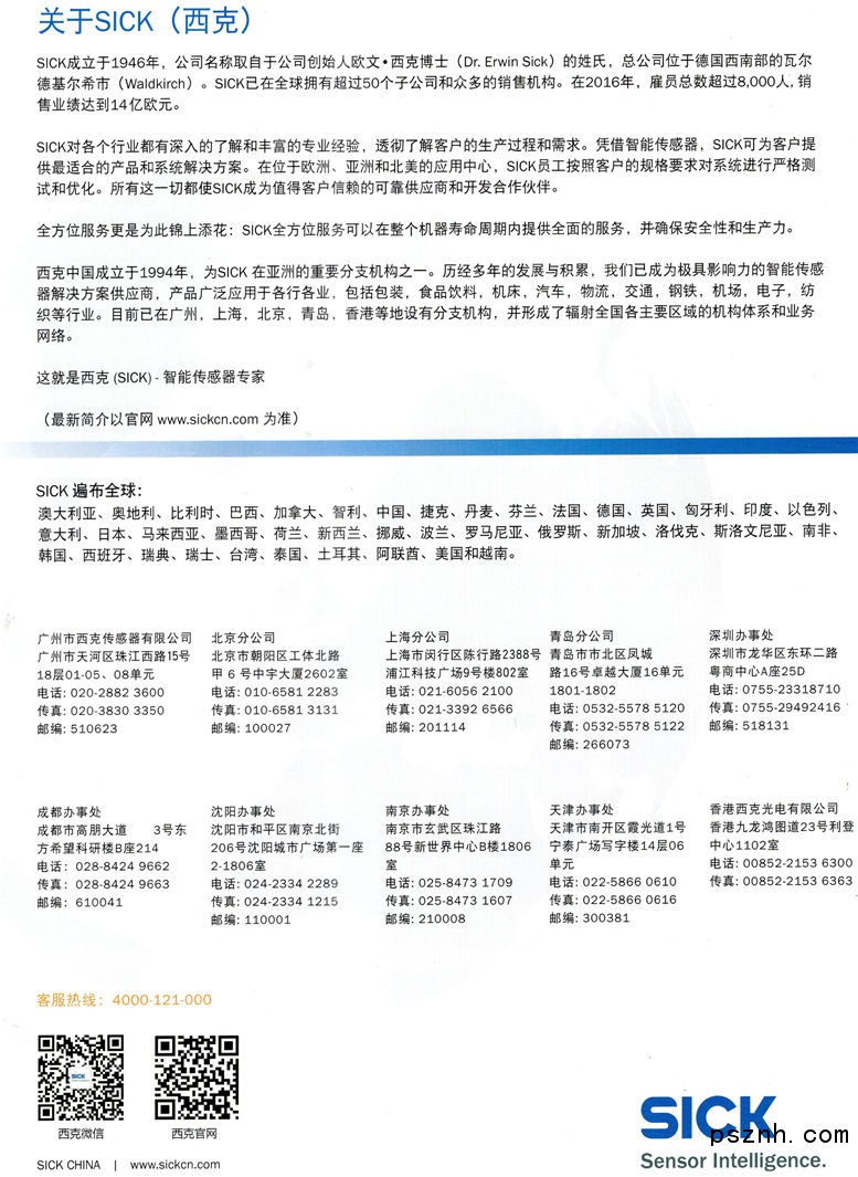 廣州市西克傳感器有限公司  SICK 成立于 1946 的企業,擁有 50 多家子公司和股權投資公司以及眾多代理機構,足跡遍及世界各地。2017 財政年度,SICK 在全球擁有 9,000 多名員工,集團年收入近 15 億歐元。
