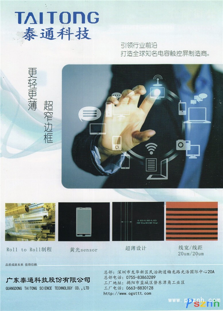 廣東泰通科技股份有限公司是專業從事電容觸摸屏(Touch Panel/Window)研發、制造、銷售于一體的高科技企業。公司于2012年10月8日成立,位于廣東省揭陽市經濟技術開發區,注冊資本6000萬元,總投資額3億元,占地面積150畝;主營產品為膜(Film)結構投射式電容觸控屏(CTP)及模組,年產能3600萬片。產品廣泛應用于手機(Mobile)、衛星導航系統(GPS)、汽車電子、數位相機等中小尺寸可攜式電子產品用ITO觸控面板(Touch Panel/Window),以及筆記本電腦(Note Book)、工業控制產品、家用電器等大尺寸電子產品觸控面板領域。 公司擁有標準的百級無塵生產車間(符合Fed-std-209E潔凈室標準),并從臺灣、日本和法國等地引進國際先進的現代化的全自動生產設備,立足高起點,采用了代表觸摸屏行業未來發展趨勢的卷對卷(Roll to Roll)的黃光制程工藝,可實現超窄邊框、更高精度和更高良率的產品生產,為廣大客戶提供更好的服務。