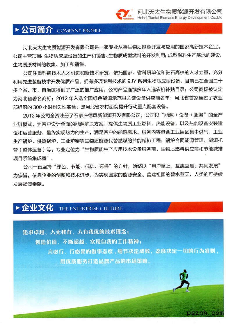河北天太生物質能源開發有限公司是一家專業從事生物質能源開發與應用的國家高新技術企業。公司主營項目:秸稈壓塊機、玉米秸稈壓塊機及其它生物質成型設備的生產、銷售、開發和利用;成型燃料生產基地的建設;生物質原材料的收集、加工和銷售。