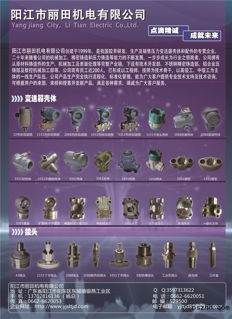 陽江市麗田機電有限公司 創建于1999年,是我國較早研發、生產及銷售壓力變送器殼體和配件的專營企業。二十年來隨著公司的機械加工、精密鑄造和壓力鑄造等能力的不斷發展,一步步成長為行業之領跑者。公司擁有從原材料鑄造件的生產、機械加工及表面處理等完整產業鏈,下設有技術開發部、不銹鋼精密鑄造部、鋁合金壓鑄部及數控機械加工部等。公司現有員工近200人,已形成以工程師、技師為技術骨干,以高級工、中級工為主體的一線生產隊伍。公司產品生產完全執行流程化、標準化管理,能為廣大客戶提供專業技術支持及技術咨詢,可根據用戶的來圖、來樣和授意開發新產品,滿足各種需求,竭誠為廣大客戶服務。