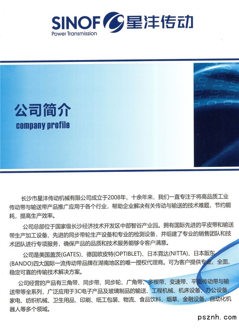 長沙市星灃傳動機械有限公司(原長沙市星豐工業皮帶有限公司)自2005年始一直專注于工業傳動帶與輸送帶的研究與服務事業。公司經營品牌為“SINOF”(司諾豐),專業生產優質同步帶和輕型輸送帶的加工。 星灃公司是湖南省內目前具規模、專業的從事傳動帶和輕型輸送帶的研究和加工的生產型企業。擁有先進的輸送帶加工設備和檢測設備,完善的質量控制體系以及專業的銷售團隊和技術團隊進行專項服務。確保產品質量和服務質量讓廣大客戶滿意。 星灃公司的產品材質從橡膠,聚氨酯(PU),人工合成皮革,聚氯乙烯(PVC),聚乙烯(PE)、聚酯Hytrel、硅膠Silicon等全列,一站式采購,并可提供傳動帶的二次加工服務,如加耐磨(紅綠白黑)膠、PU膠、打孔、開槽、海綿、花紋、裙邊、擋板、導向條、轉彎機等,并可免費為客戶提供帶與帶輪的匹配與設計選型和配套供應服務。產品廣泛應用于紡織、印染、機場物流、煙草、運動、木工、食品、汽車制造、陶瓷、鋼鐵、石材加工、造紙印刷等行業。 星灃傳動公司也是日本三星(MITSUBOSHI)和美國蓋茨(GATES)兩大國際品牌傳動帶的湖南特約經銷商,常備庫存量大、交貨期短、并以優質、專業的服務贏得客戶的一致好評。 隨著國內經濟發展快速增長,本公司也正處在飛速發展的進程中,生產規模日益壯大。我們將立足長沙,輻射湖南,放眼全中國。一如既往的為客戶提供優質、全面的業務服務!