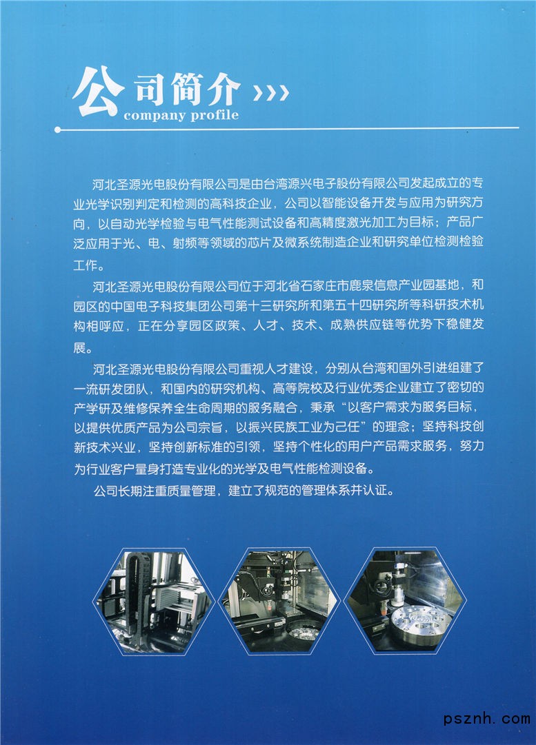 河北圣源光電股份有限公司主產(chǎn)品有金屬探測器,金屬探測儀,金屬檢測機(jī),金屬檢測儀,檢針機(jī),金屬分離器,X射線異物檢測機(jī),X射線安檢機(jī),重量選別機(jī),重量分級機(jī)等設(shè)備,公司位于交通便利、京津冀一體化的河北省石家莊市,是一家由臺灣源興電子股份有限公司發(fā)起成立的專業(yè)光學(xué)識別判定的高科技企業(yè)。近期公司和園區(qū)的中國電子科技集團(tuán)公司第十三研究所和第五十四研究所等科研技術(shù)機(jī)構(gòu)相呼應(yīng),共同利用園區(qū)極為方便的人才技術(shù)、產(chǎn)業(yè)政策和高度成熟的供應(yīng)鏈已研制出一系列適合各類客戶需求的檢測設(shè)備,為眾多客戶提供了各種完善的解決方案和大量的產(chǎn)品和服務(wù),擁有極為廣泛的客戶群體,產(chǎn)品直接銷售到全國各地,并取得了一定的成績,在同行業(yè)中享有很高的知名度。
