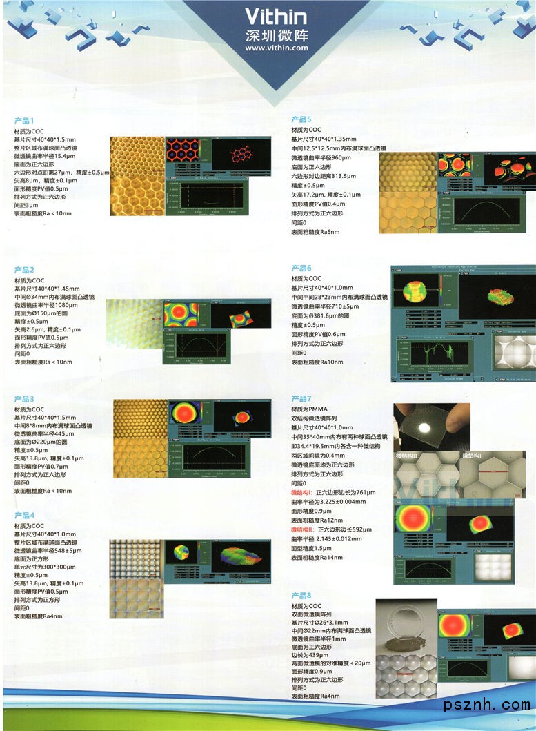 公司專注于聚合物微透鏡陣列的研發與生產,材料通常選用PMMA和COC,微透鏡陣列可用于光信息處理、光計算、光互連、光數據傳輸,也可用于復印機/掃描儀/傳真機、光場照相機,以及醫療衛生器械中,并可廣泛用于通信、顯示和成像器件當中。在消費電子領域,常見的應用有VR/AR、3D成像與顯示、微型投影儀、LED照明、迎賓光毯/天使之翼、夜視儀