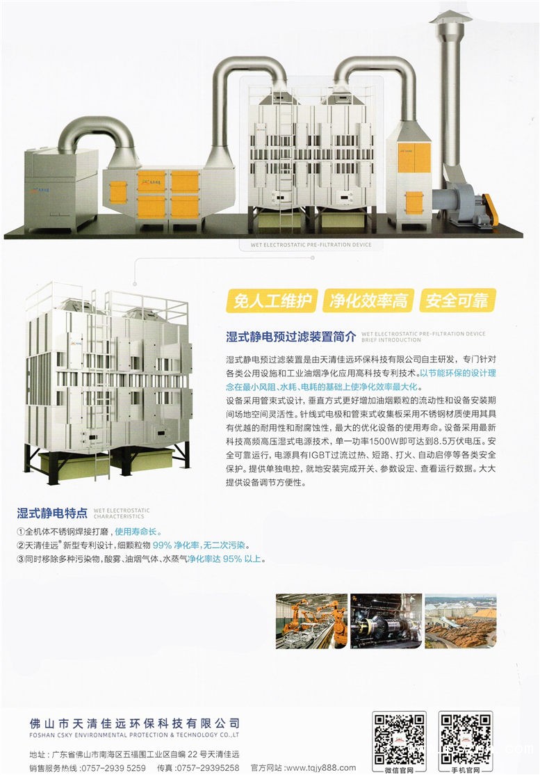 佛山市天清佳遠環保科技有限公司專業研發生產高低空排放餐飲油煙凈化器、工業油煙凈化器、工業廢氣凈化器,VOC有機廢氣除臭設備,設備廣泛應用于酒店餐館,食品加工,皮革紡織,印染印刷,橡膠塑料,噴漆油霧等行業油煙廢氣臭氣的處理。企業嚴格遵循6S標準生產流程和GT系統化管理。