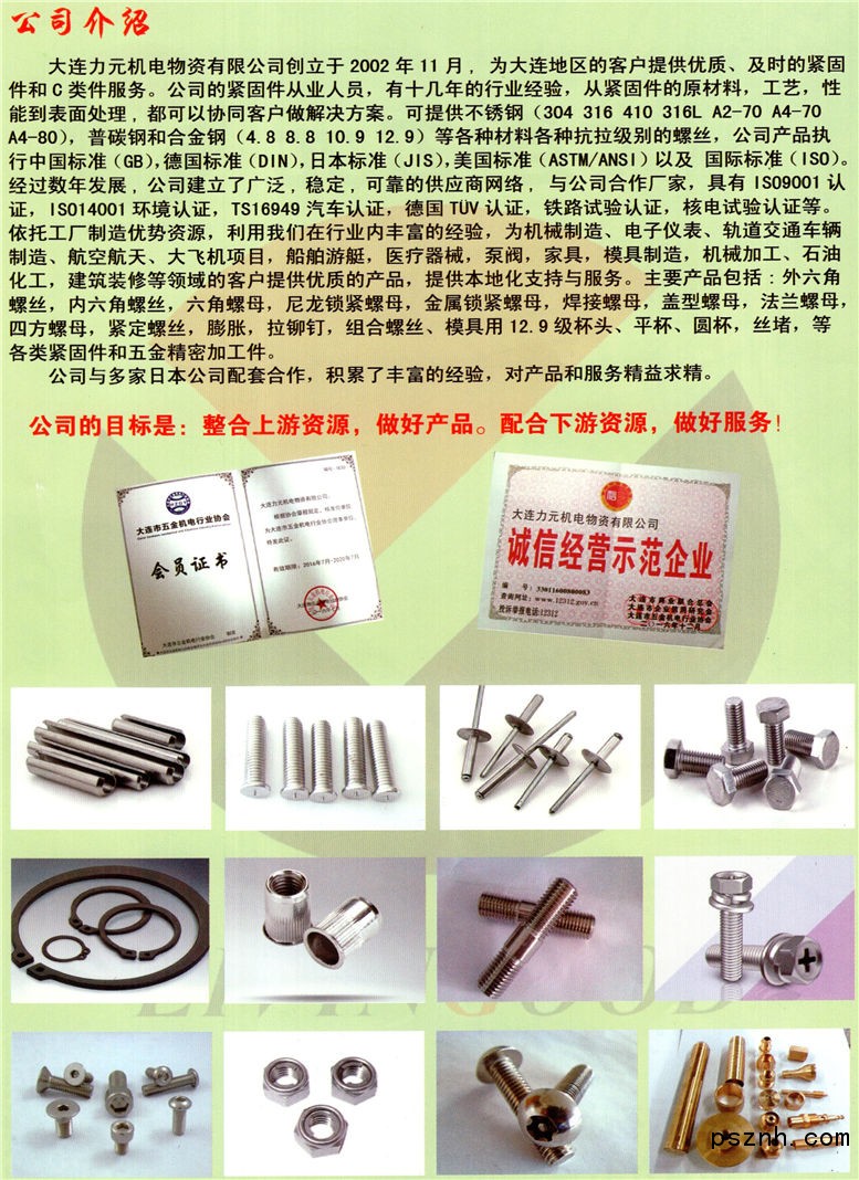 大連力元機電物資有限公司創立于2002年11月, 為大連地區的客戶提供優質、及時的緊固件和C類件服務。公司有超過10年以上經驗的專業緊固件從業人員,從緊固件的原材料,工藝,性能到表面處理,都可以協同客戶做解決方案。可提供不銹鋼(304 316 410 316L A2-70 A4-70 A4-80),4.8級至12.9級等各種材料各種抗拉級別的螺絲,公司常備庫存執行中國標準(GB),德國標準(DIN),日本標準(JIS),美國標準(ASTM/ANSI)以及 國際標準(ISO)。經過數年發展,公司建立了廣泛,穩定,可靠的供應商網絡, 公司的合作伙伴廠家,具有ISO9001認證, ISO14001環境認證, TS16949汽車認證,德國TUV認證,鐵路試驗認證,核電試驗認證等。 依托工廠制造優勢資源,利用我們在行業內豐富的經驗,為區域內電子、精密機械制造、汽車、軌道交通車輛制造、設備維修、電氣安裝、船舶游艇制造,醫療器械,泵閥,家具, 機車汽車,電器制造,模具制造,機械加工、石油化工,建筑裝修等領域的客戶提供優質的產品,本地化支持與服務。主要產品包括:外六角螺絲,內六角螺絲,六角螺母, 尼龍鎖緊螺母,金屬鎖緊螺母,焊接螺母,蓋型螺母,法蘭螺母,四方螺母,長 螺母,緊定螺絲,平杯圓杯,塞打,膨脹,拉鉚釘,組合螺絲等。