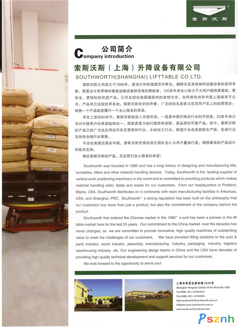 索斯沃斯公司成立于1890年,是設計和制造液壓升降臺、翻轉臺及其他物料運輸設備的資深專家,更是當今世界物料垂直運輸設備供貨商的領跑者,120多年來全心致力于為用戶提供更高效、更安全、更輕松的優質產品。公司總部在美國緬因州的波特蘭市,在阿肯色州和中國上海建有子公司,產品早已遠銷世界各地。索斯沃斯良好的聲譽、廣泛的知名度建立在其用戶至上的經營理念:銷售一個產品就是履行一個全心服務的承諾。
