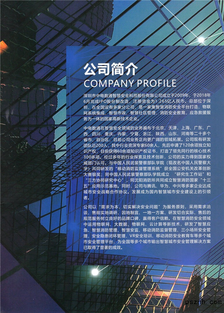 深圳市中電數通智慧安全科技股份有限公司成立于2009年,于2018年6月完成IPO股份制改造,注冊資金為1.265億人民幣。總部位于深圳,在全國設有多家分公司,是一家集智慧消防安全平臺打造、物聯網系統集成、智慧市政、智慧社區管理、消防安全教育、應急救援服務為一體的國家高新技術企業。
