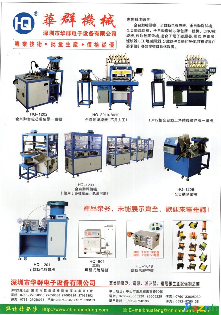 原華鋒成立于2001年公司堅持“質量第一,用戶至上”的原則,服務於用戶,讓用戶滿意,為用戶提供優質的產品和服務.我們生產的產品無論是從外部形象設計和內部元件選配及生產過程,都經過嚴格的質量把關,我們深切地感受到品質和誠信是公司立足市場及成功發展的基石. 公司產品:全自動繞線機,全自動包膠帶機,全自動焊錫機,全自動測試機,CNC繞線機,無鉛錫爐,切角機等等以及其它相關零備件。適用于變壓器,電感,濾波器,續電器等整廠設備可根據客戶要求,設計自動化流水線設備。 公司承諾:凡本公司產品自售出之日起,機體保用一年,終身維護.