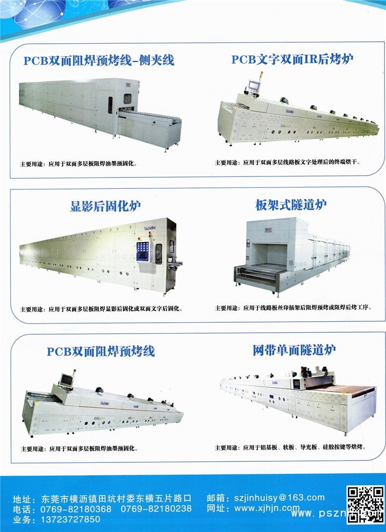 本公司生產的波段隧道爐系列有PCB雙面阻焊波段烘干線、翻頁式顯影后固化線、PCB雙面文字波段烘干線、MPCB FPC單面波段烘干線,根據客戶的產能及場地來選擇不同的倉數(即不同的烘干長度)。 本公司生產的烘干線在使用中達到以下優點:縮短了烘烤時間、節能達到55%以上、可對接自動化設備連線生產、減少大批勞動力、提高成品率、節約生產場地、提高產能、減少輸送掛具、穩定產品質量、降低生產成本、提高利潤5%至10%、安全防火排泄暢通。