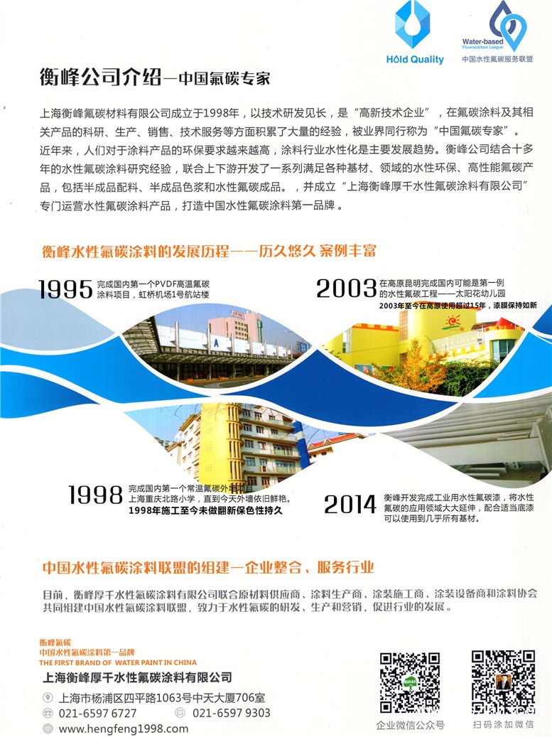 近年來,人們對于涂料產品的環保要求越來越高,涂料行業水性化是主要發展趨勢。為此,衡峰公司結合近10年的水性氟碳涂料研究經驗,聯合專業做水性氟樹脂的長興集團,專業做色漿的納美集團,和朗盛等優質顏料商以及配套涂裝設備商,成功開發了一系列滿足各種基材、領域的水性環保、高性能氟碳產品,包括半成品配料、半成品色漿和水性氟碳成品。客戶拿到水性氟碳半成品便可簡單、快速完成水性氟碳涂料的生產。