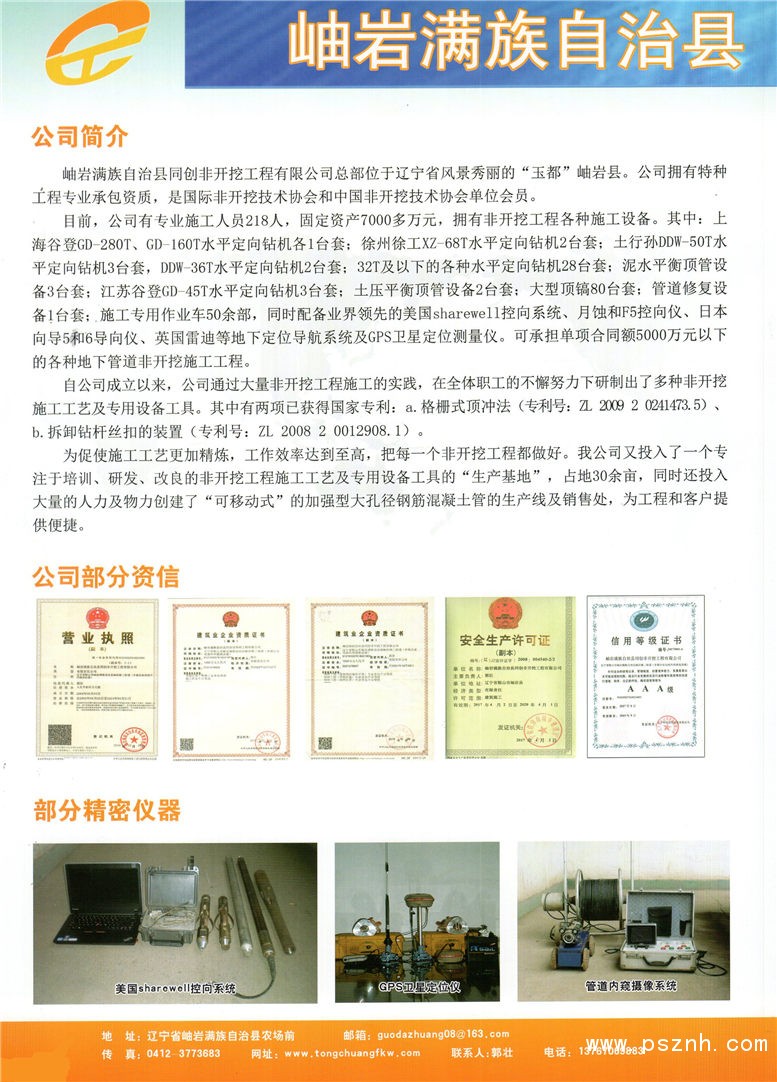 岫巖滿族自治縣同創非開挖工程有限公司總部位于遼寧省風景秀麗的“玉都”岫巖縣。公司擁有特種工程專業承包資質,是國際非開挖技術協會和中國非開挖技術協會單位會員。