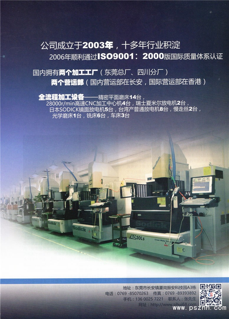 公司擁有廣大的生產(chǎn)制造能力。在國(guó)內(nèi)擁有三個(gè)加工工廠(東莞總廠、上海分廠四川分廠),兩個(gè)營(yíng)運(yùn)部(國(guó)內(nèi)營(yíng)運(yùn)部在長(zhǎng)安,國(guó)際營(yíng)運(yùn)部在香港),擁有世界一流的加工設(shè)備,日本精密平面磨床14臺(tái),28000r/min高速CNC加工中心機(jī)4臺(tái),瑞士夏米爾放電機(jī)4臺(tái),日本SODICK鏡面放電機(jī)5臺(tái),臺(tái)灣產(chǎn)普通放電機(jī)12臺(tái),CNSC加工中心6臺(tái),慢走絲4臺(tái),光學(xué)磨床2臺(tái),銑床6臺(tái),車床3臺(tái),各加工工廠和各部門(mén)通過(guò)優(yōu)化組合,模具設(shè)計(jì)與制造和精密模具零件加工三大生產(chǎn)體系,以產(chǎn)品為龍頭帶動(dòng)塑膠模具的開(kāi)發(fā)設(shè)計(jì),制造以及售后維護(hù)等。產(chǎn)品主要銷往日本、歐美和中國(guó)大陸等地,因精度高、質(zhì)量好、納期短等特點(diǎn)、已贏得了國(guó)內(nèi)外廣大客戶的贊譽(yù)和信任。