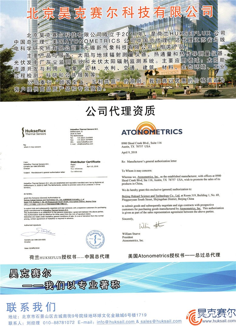 北京昊克賽爾科技有限公司成立于2017年,是荷蘭Hukseflux 公司中國總代理;美國Atonometrics 公司中國總代理;還代理江蘇省無線電科學研究所有限公司(無錫新氣象科技有限公司)相關產品。