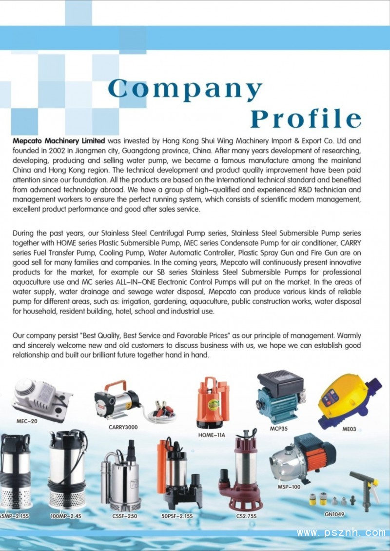 幾年來,本公司生產(chǎn)的MSP、SSP系列不銹鋼地面泵,CSS(F)、FSS(F)、50PS、CS2.75不銹鋼潛水泵、HOME系列經(jīng)濟(jì)型塑膠潛水泵,MP系列專業(yè)養(yǎng)魚泵,MEC系列空調(diào)排水泵,CARRY系列汽車油泵,冷卻泵,還有ME03型水流控制開關(guān)、GN1049型自動(dòng)加壓清洗槍、M-352噴火槍等產(chǎn)品深受千家萬戶和企業(yè)的歡迎。在未來的日子裏,麥加道會(huì)因應(yīng)市場需求繼續(xù)開發(fā)實(shí)用新穎的新產(chǎn)品,例如我們Vinflo液壓控制器和CS2.4系列排水泵于2012年2月正式推向市場,HOME-10超低水位潛水泵于11月全面發(fā)售。在供水,排水和污水領(lǐng)域,麥加道生產(chǎn)的可靠性高的多種泵型可廣泛應(yīng)用於諸如灌溉、園藝、養(yǎng)殖業(yè),水產(chǎn)業(yè)、市政工程、生活及工業(yè)供水、汙水處理等方面。