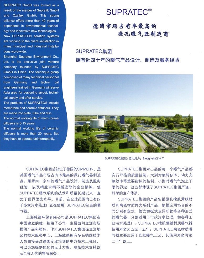 世浦泰集團(Supratec Group)中國總部位于上海,歐洲業(yè)務(wù)總部位于德國Simmern/Hunsrück,是以德國先進成熟的MBR技術(shù)、實施工藝和關(guān)鍵自有德國核心配套設(shè)備為依托的全方位一站式水處理服務(wù)提供商,以及智能模塊化村鎮(zhèn)污水處理系統(tǒng)供應(yīng)商。