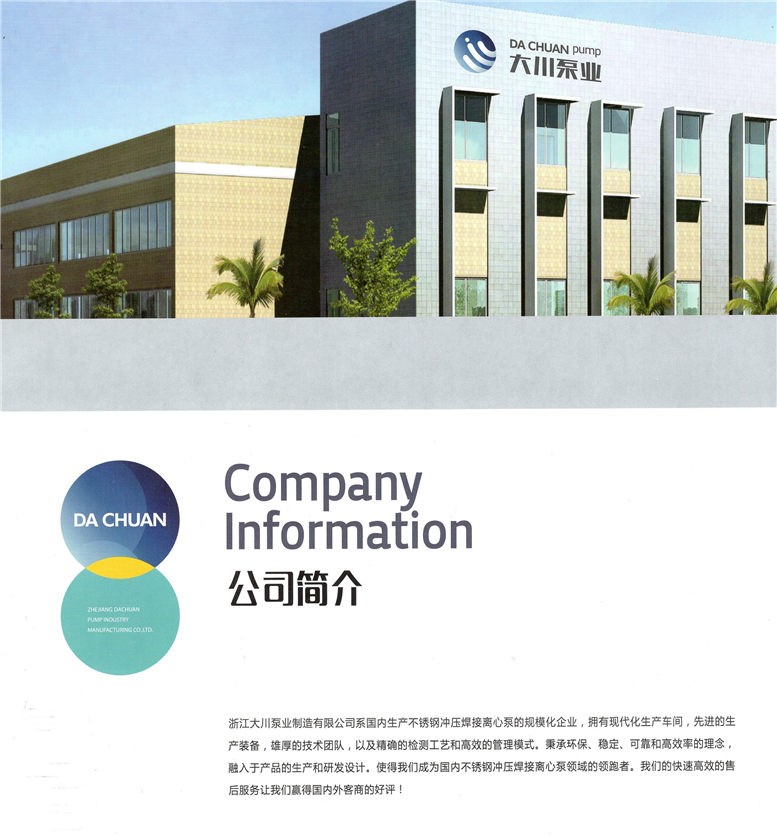 浙江大川泵業制造有限公司是一家專業致力于水泵產品研發﹑生產﹑銷售為一體的科技創新型企業。成立之初憑借自動化領域的專業水平和成熟技術,在泵類領域迅速崛起。依靠科技發展并充分引進吸收國外先進技術的基礎上,不斷為用戶提供滿意的高質量產品。