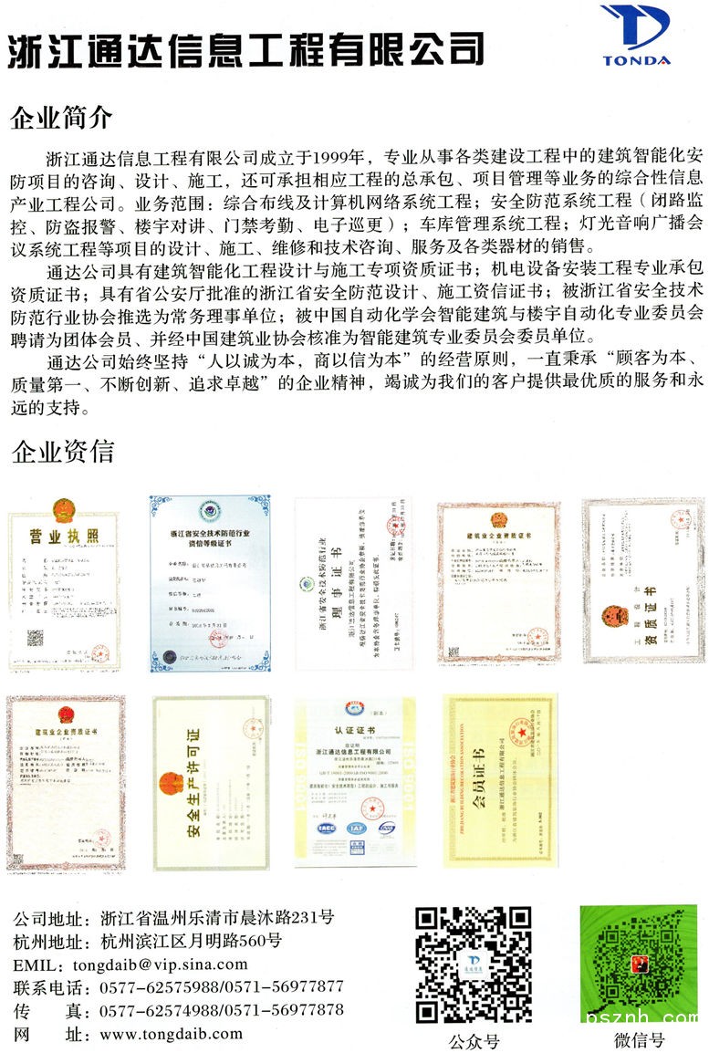 通達(dá)公司擁有建筑智能化工程設(shè)計與施工一體化資質(zhì)證書;有線廣播電視工程設(shè)計、安裝許可證;機(jī)電設(shè)備安裝工程專業(yè)承包資質(zhì)證書;具有省公安廳批準(zhǔn)的浙江省安全防范設(shè)計、施工資質(zhì)證書;被浙江省安全技術(shù)防范行業(yè)協(xié)會推選為常務(wù)理事單位;被中國自動化學(xué)會智能建筑與樓宇自動化專業(yè)委員會聘請為團(tuán)體會員、并經(jīng)中國建筑業(yè)協(xié)會核準(zhǔn)為智能建筑專業(yè)委員會委員單位。