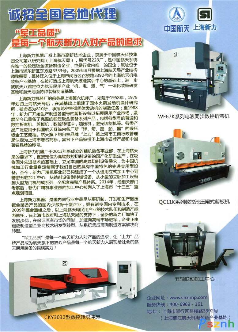 重組前上海新力機(jī)器廠的前身是上海第六機(jī)床廠,始建于1958年,1978年劃歸上海航天局后,在其基礎(chǔ)上組建了固體火箭發(fā)動機(jī)設(shè)計研究所,被命名為810所,承擔(dān)地空導(dǎo)彈固體發(fā)動機(jī)的制造任務(wù);至1988年,新力廠開始生產(chǎn)制造各型號的剪折設(shè)備以拓展民用產(chǎn)業(yè)市場,發(fā)展至今已具備了完整的鍛壓鈑金裝備系列產(chǎn)品,包括各型號的普通和數(shù)控折彎機(jī)、剪板機(jī),數(shù)控轉(zhuǎn)塔沖,油壓機(jī),激光切割機(jī)等。各類產(chǎn)品廣泛應(yīng)用于我國航天系統(tǒng)內(nèi)各廠所“彈、箭、星、船、器”的鍛壓鈑金工藝流程。航天旗下的自主品牌“上力”被上海市工商行政管理局認(rèn)定為上海市著名商標(biāo),其名下產(chǎn)品被授予上海市名牌產(chǎn)品和中國著名品牌的稱號。