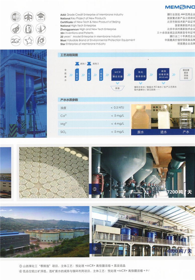 采用TIPS法制備的聚偏氟乙烯(PVDF)超濾膜產品是中環膜核心膜制造技術。因其更加高效節能,更長使用壽命以及更低維護成本的特質,獲得廣泛的應用與推廣,已經在國內20個行業和全球十多個地區的上百個案例中使用,2014年該產品列入國家重點新產品立項項目。同時利用自身在濃鹽水減量化方面的多年技術和經驗積累,開發出MCR(膜化學反應器)新型污水處理技術和裝備,在陜西、山西、內蒙、山東等煤化工和電廠含鹽廢水減量化及液體“零排放”項目中取得成功應用并起到很好的示范效應。截止日前共獲取了以“中空纖維膜制備方法、中空纖維膜及潛溶劑組合物”等膜分離方向為代表的30余項發明及實用新型專利。中環膜位于北京密云的研發生產基地,中空纖維超濾膜產能達到每年100萬平方米,
