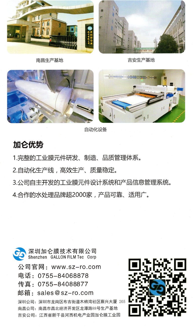 深圳加侖膜技術有限公司(以下簡稱GALLON)是集反滲透膜組件研發生產、膜設備制造應用及工程水處理系統設計施工為一體的高科技企業。