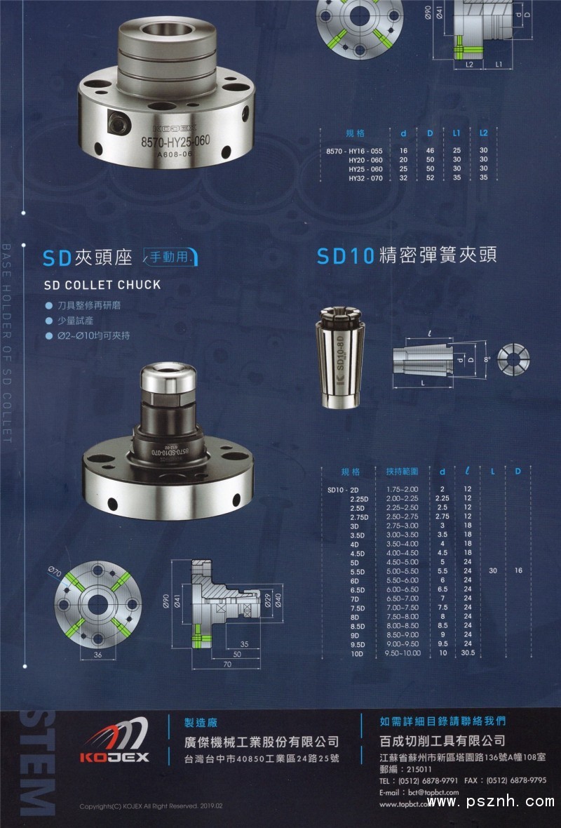 總公司KOJEX成立于1988年,專業制造數控銑床用的刀把、夾頭、刀具,努力提供高品質產品,多年來深受國內外客戶歡迎與肯定,讓我們深感安慰與謝意。近十年來更致力于高速主軸夾頭等產品的研究開發,已有能力提供120,000rpm主軸所需的夾頭(精度可達2μ,安全彈性100,000次以上)至于在高速回轉加工中所產生的金屬變形、震動頻率、把握力減弱、動態平衡等等。。各種問題,我們在產品設計測試過程中完全為客戶考慮到了。這些影響品質效率及安全問題因素,經過多次研究實驗,推出最新DC,UC,HEC,SD及HPC等高品質系列產品,來滿足客戶對高速數控銑床高標準的要求,給客戶更多的信心與滿意。今后我們更期勉自己在產品的品質、精度、安全及成本上更高的突破,希望與客戶在高速化的時代一同拼出好成績。