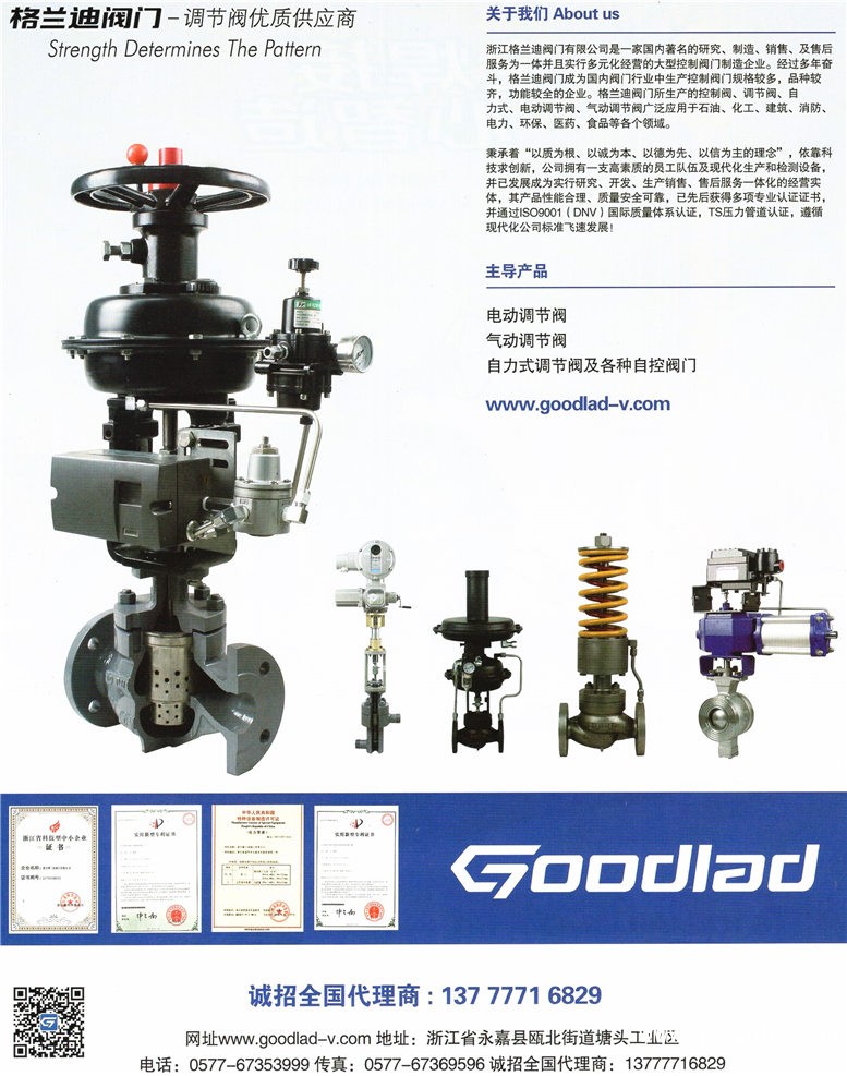 浙江格蘭迪閥門有限公司是一家集研究、制造、銷售、及售后服務為一體并且實行多元化經營的閥門制造企業。經過多年奮斗,格蘭迪閥門成為生產控制閥門規格較多,品種較齊,功能較全的企業。主要產品有調節閥,電動、氣動閥門及執行機構。