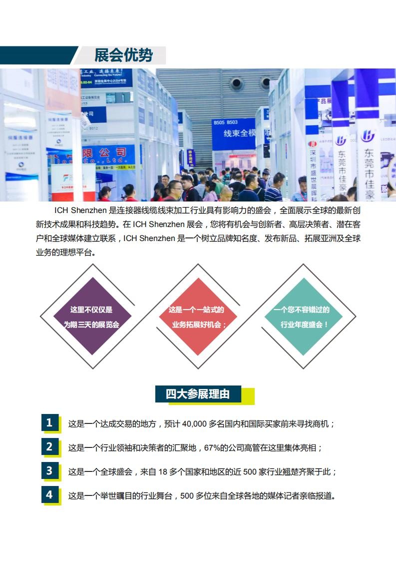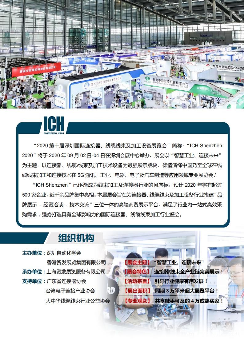 “2020第十屆深圳國際連接器、線纜線束及加工設備展覽會”簡稱:“ICH Shenzhen 2020”將于2020年09月02日-04日在深圳會展中心舉辦,展會以“智慧工業、連接未來”為主題,以連接器、線纜\線束及加工技術設備為最強展示版塊,傾情演繹中國乃至全球在線纜線束加工和連接技術在5G通訊、工業、電器、電子及汽車制造應用領域專業展覽會!“ICH Shenzhen”已逐漸成為線束加工及連接器行業的風向標,預計2020年將有超過600家企業,近千余品牌集中亮相。本屆展會旨在為連接器、線纜線束及加工設備行業搭建“品牌展示 - 經貿洽談 - 技術交流”三位一體的高端商貿展示平臺,滿足了行業內一站式高效采購需求,強勢打造具有全球影響力的國際連接器、線纜線束加工行業盛會。