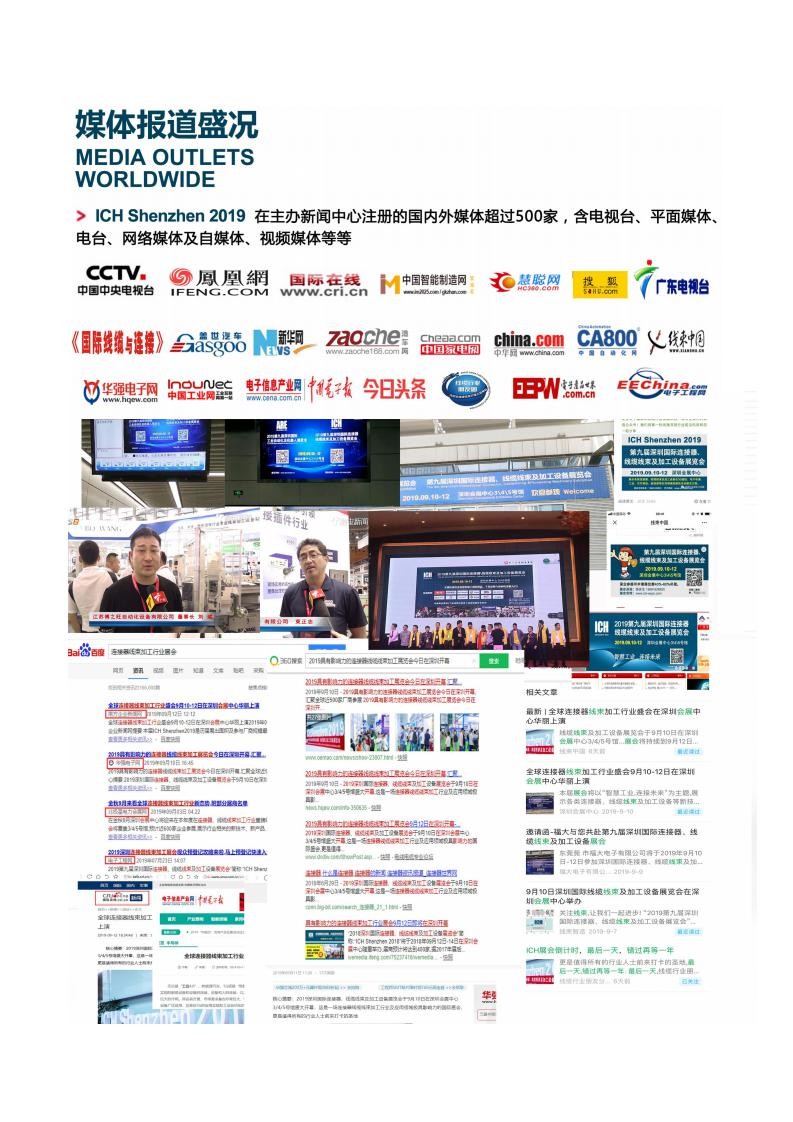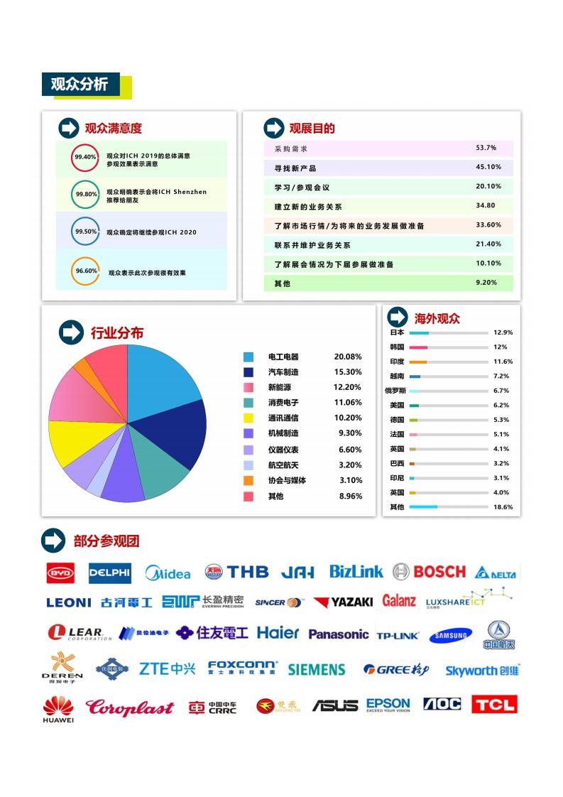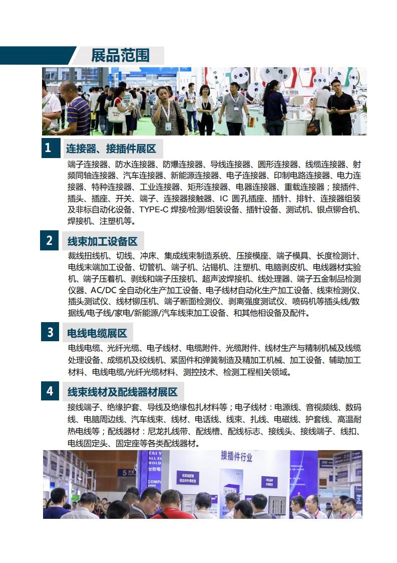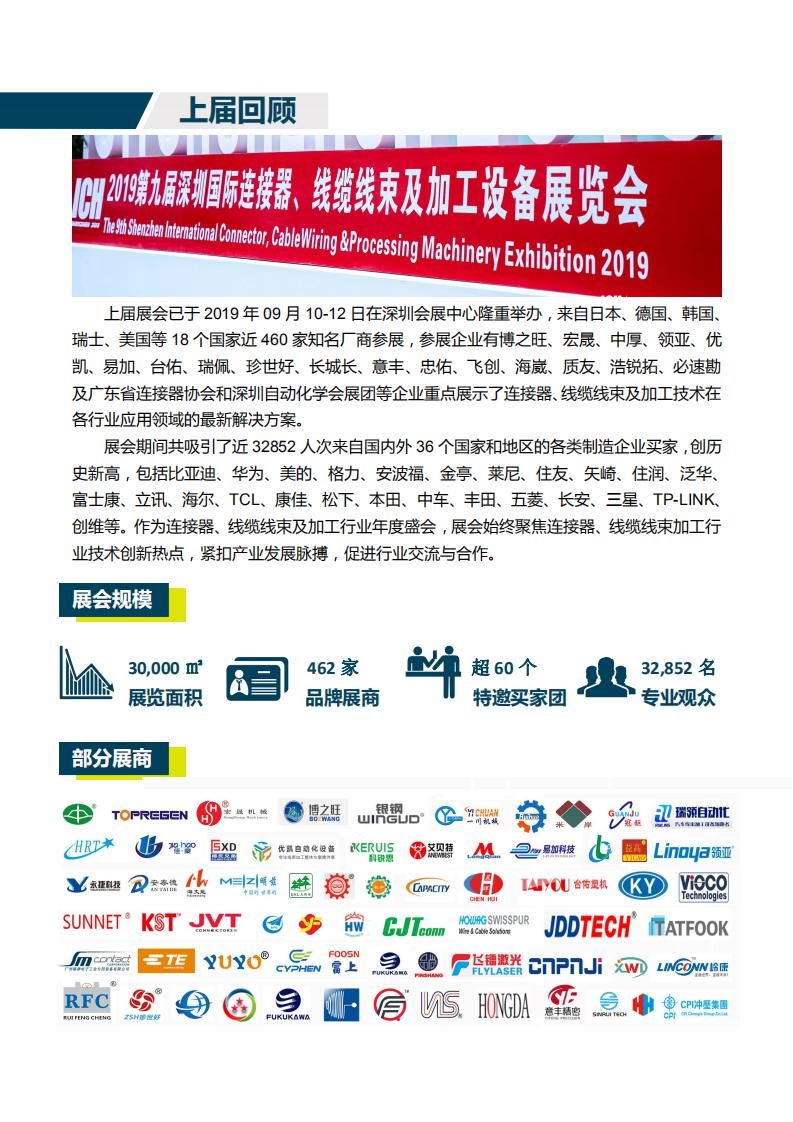 上屆展會已于2019年09月10-12日在深圳會展中心盛大開幕,來自日本、德國、韓國、瑞士、美國等18個國家近460家知名廠商參展,參展企業有博之旺、宏晟、中厚、領亞、優凱、易加、臺佑、瑞佩、珍世好、長城長、意豐、忠佑、飛創、海崴、質友、浩銳拓、必速勘及廣東省連接器協會和深圳自動化學會展團等企業重點展示了連接器、線纜線束及加工技術在各行業應用領域的最新解決方案。展會期間共吸引了近32852人次來自國內外36個國家和地區的各類制造企業買家,創歷史新高,包括比亞迪、華為、美的、格力、安波福、金亭、萊尼、住友、矢崎、住潤、泛華、富士康、立訊、海爾、TCL、康佳、松下、本田、中車、豐田、五菱、長安、三星、TP-link、創維等。作為連接器、線纜線束及加工行業年度盛會,展會始終聚焦連接器、線纜線束加工行業技術創新熱點,緊扣行業發展脈搏,大力促進產業交流與合作。