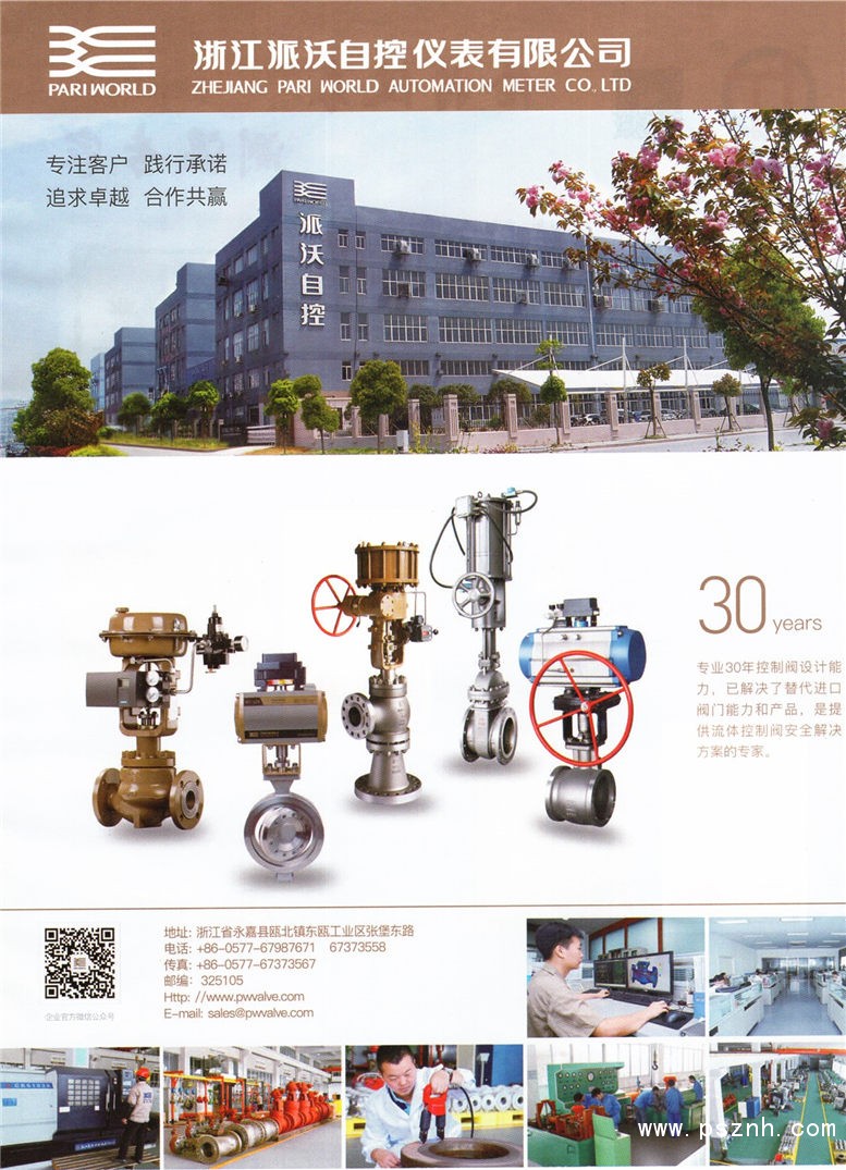 浙江派沃自控儀表有限公司(原永嘉縣東方自動化儀表廠)是控制領域研發及生產的領先企業之一。公司始建于1985,注冊資金5020,二十余年致力于產品的開發與創新。公司的產品質量穩定可靠并以其獨特的性能在廣大用戶中享有較高的信譽,不斷引進消化國外先進,自行研制了特種調節閥,應用于自動化成套技術方面達到國際先進水平,使產品在控制系統領域里,再登新臺階。