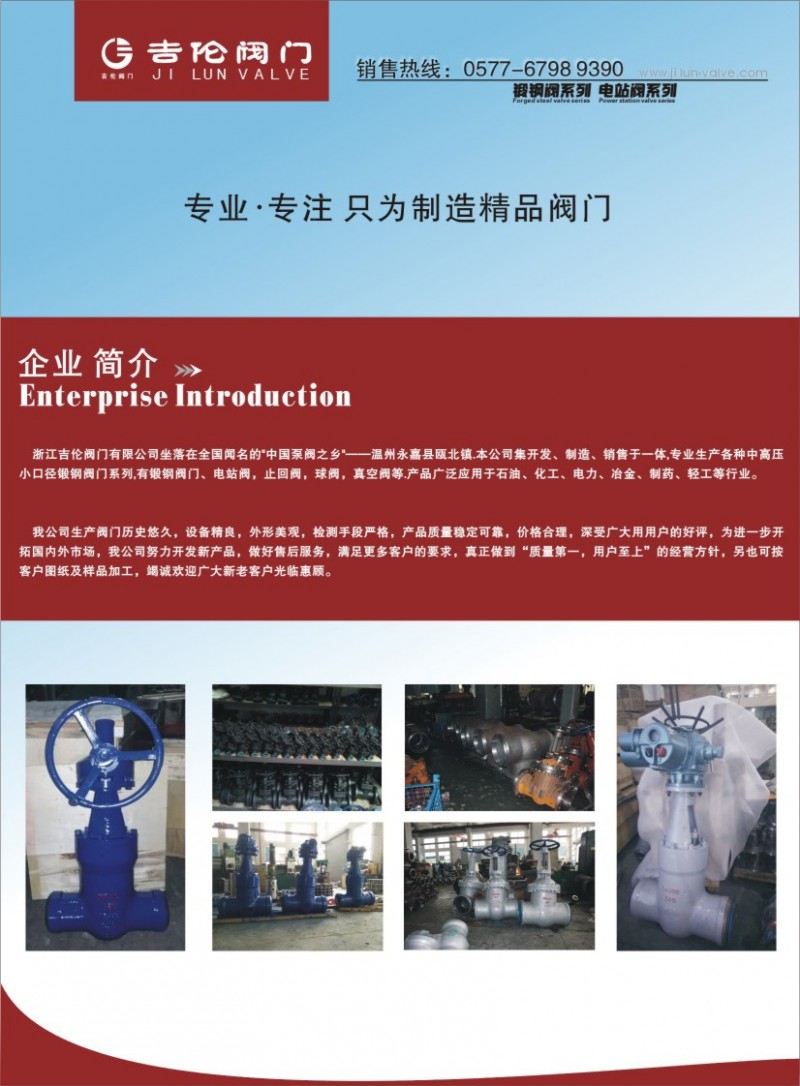 浙江吉倫閥門有限公司坐落在全國聞名的“中國泵閥之鄉”——溫州永嘉縣甌北鎮。本公司集開發、制造、銷售于一體,專業生產各種中高壓小口徑鍛鋼閥門系列,有鍛鋼閘閥鍛鋼截止閥鍛鋼止回閥鍛鋼球閥等。產品按照國際標準API、ANSI、JIS、ISO、BS及JB、GB國內先進標準生產。