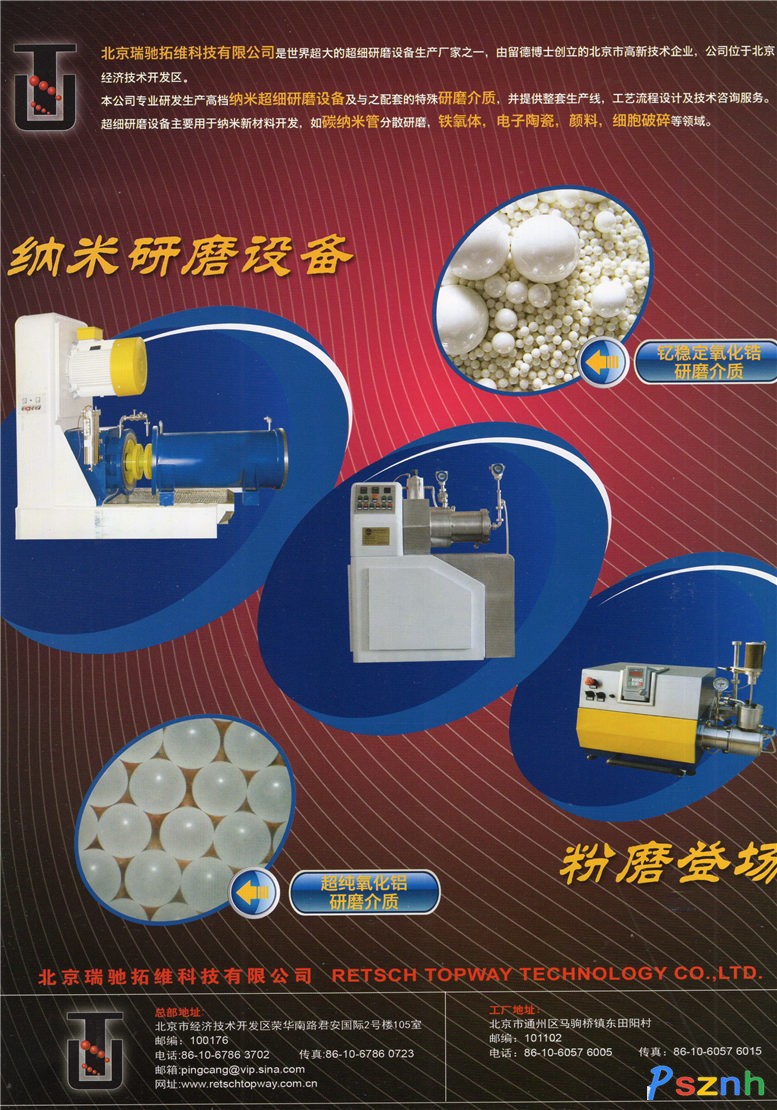 北京瑞馳拓維科技有限公司是一家專業研究、開發、生產各種陶瓷研磨介質和大型濕法研磨設備的高科技企業。臥盤式砂磨機HDM系列(筒體容積從20-1200升)主要用于化纖鈦白粉的分散,技術陶瓷原料,鈦白粉生產,非金屬礦等領域。離心臥式砂磨機HZM系列主要用于,噴繪油墨(Jet-Ink),芯片拋光液(CMP), 電子陶瓷(MLCC),細胞破碎(Cell-Disruption)等領域。瑞馳拓維科技有限公司生產各種特殊陶瓷研磨介質,如氧化鋯,碳化硅,碳化硼,氮化硅等。瑞拓公司生產的研磨珠和砂磨機已經出口歐洲,韓國和印度等地區和國家.在國內外市場上樹立了在同類產品中的知名度。
