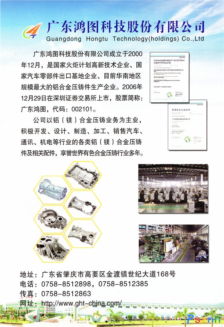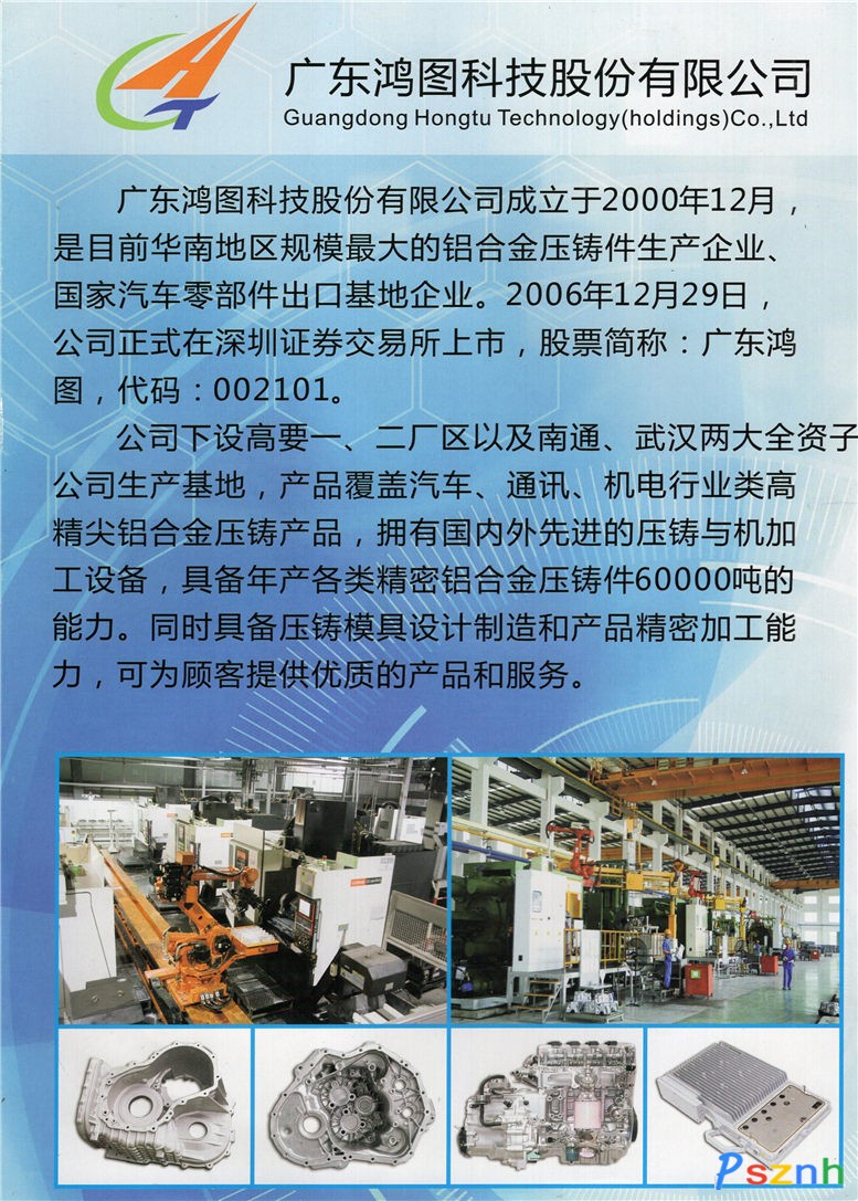 廣東鴻圖科技股份有限公司 (簡稱“廣東鴻圖”)位于風景秀麗的肇慶市。公司成立于2000年12月,是由高要鴻圖工業有限公司、廣東省科技創業投資公司、廣東省科技風險投資有限公司、高要市國有資產經營有限公司、廣東省機械研究所等股東共同發起設立的一家國有控股企業,是國內壓鑄行業的龍頭企業,華南地區規模最大的精密鋁合金壓鑄件專業生產企業,廣東省高新技術企業,擁有廣東省唯一的省級精密壓鑄工程技術研究開發中心。公司具備國家汽車零部件出口基地企業資格,并已通過ISO14001、ISO9000、ISO/TS16949等國際質量體系認證。2006年12月29日,公司股票在深圳證券交易所正式掛牌上市。