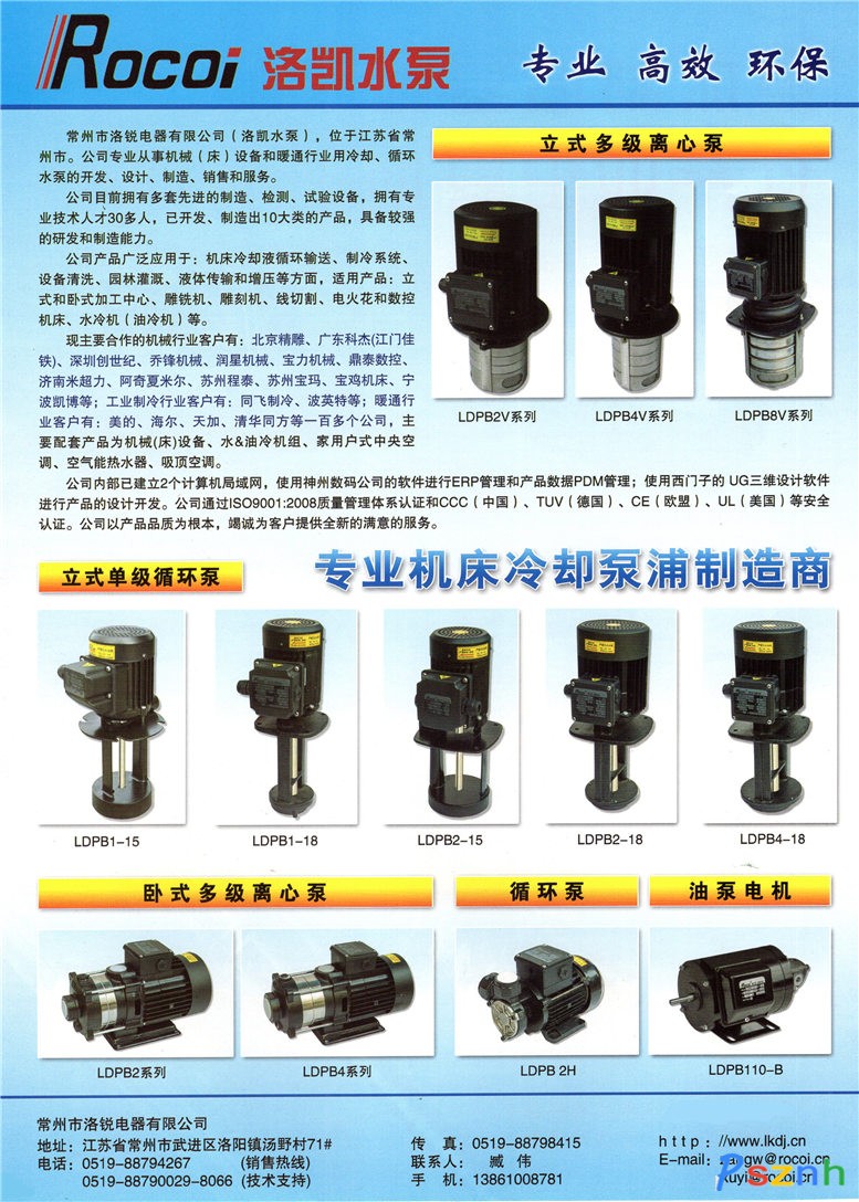 洛銳電器(睿嘉泵業(yè))成立于1996年,目前公司專業(yè)從事:戶式中央空調(diào)以及嵌入式空調(diào)(又名吸頂空調(diào))用循環(huán)泵 及排水泵、機(jī)床設(shè)備用冷卻循環(huán)水泵及機(jī)床設(shè)備冷卻系統(tǒng)用的水泵等產(chǎn)品的開發(fā)、設(shè)計(jì)、制造、銷售和服務(wù)。目前已經(jīng)配備的生產(chǎn)設(shè)備有:5條電機(jī)定子自動(dòng)生產(chǎn)流水線(包括絕緣紙成型插入機(jī)、全自動(dòng)繞線機(jī)、線圈嵌入機(jī)、線圈整型機(jī)、線圈全自動(dòng)綁扎機(jī))、電機(jī)定子全自動(dòng)沉浸機(jī)、全自動(dòng)焊接設(shè)備、車削中心、數(shù)控車床等;檢測、試驗(yàn)設(shè)備有:三坐標(biāo)測量儀、投影儀、電機(jī)定子綜合測試儀、轉(zhuǎn)子平衡儀、水泵葉片平衡儀、無損探傷、水泵綜合性能測試系統(tǒng)、智能型電器安全綜合測試系統(tǒng)、鹽霧腐蝕試驗(yàn)箱、高低溫試驗(yàn)箱、灼熱絲試驗(yàn)儀、程控變頻電源等。配備了包括水泵、電機(jī)設(shè)計(jì)及制造、機(jī)械設(shè)計(jì)及制造等各種專業(yè)技術(shù)人員15人,已開發(fā)制造了8大類100多個(gè)品種和規(guī)格的產(chǎn)品,具備了較強(qiáng)的生產(chǎn)規(guī)模和制造能力,并長年與國內(nèi)外知名機(jī)床設(shè)備生產(chǎn)廠商、暖通廠商及工業(yè)制冷廠商合作配套。現(xiàn)長年合作配套的機(jī)械行業(yè)客戶有:北京精雕科技、深圳臺(tái)群、廣東科杰(江門佳鐵)、潤星科技股份、喬峰機(jī)械、寶力機(jī)械、蘇州程泰、富強(qiáng)科技、蘇州寶瑪、常州阿奇、凱博數(shù)控機(jī)械等;暖通行業(yè)及工業(yè)制冷客戶有:美的、海爾、天加、清華同方、貝萊特、妥思;同飛制冷、瑞科制冷等二百多家公司,主要配套產(chǎn)品為:所有系列機(jī)床設(shè)備、家用戶式中央空調(diào)、空氣能熱水器、吸頂空調(diào)、機(jī)床設(shè)備用水&油冷機(jī)組。目前洛銳電器正全面致力于其它領(lǐng)域用更高端的水泵及電動(dòng)機(jī)的研發(fā)工作。
