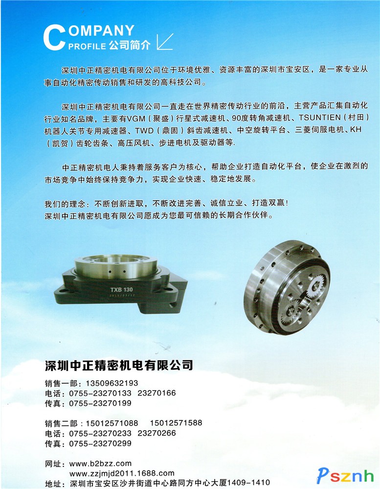 深圳中正精密機(jī)電有限公司  是由臺(tái)灣VGM減速機(jī),PHT行星減速機(jī),TWD斜齒行星減速機(jī),TWD強(qiáng)力型行星減速機(jī),中空旋轉(zhuǎn)平臺(tái),凱賀KH精密齒條等臺(tái)灣最知名的幾家工廠對(duì)大陸的專業(yè)銷售窗口,可根據(jù)客戶的需求定制各種特殊型行星式減速機(jī)。