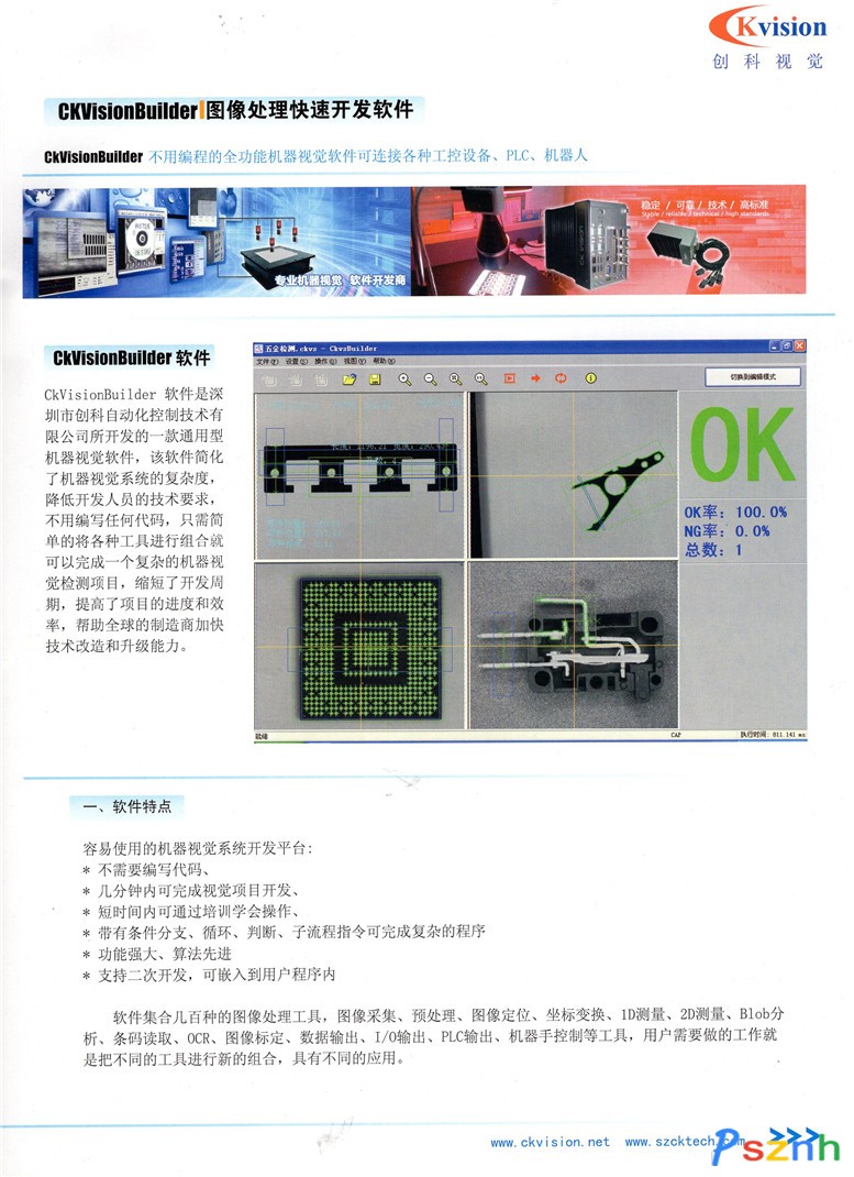 創科于2003年組建技術團度進行圖像算法研究,2005年注冊公司,目前的注冊資金為500萬人民幣。經過公司幾十位工程師和算法專家的不懈努力,成功地開發出國內首款高性能機器視覺軟件包CKVisionLib,并已經應用在不同的領域上,所推出的軟件產品填補了當時國內相關行業的空白。通過多年的努力我們已發展為實力雄厚,技術精湛的機器視覺行業專家,開發的產品達到甚至超過國際同行的水平,并于2006年通過軟件企業認證,是目前國內唯一認證的機器視覺軟件開發商,2010年公司成功推出了新一代的智能機器視覺軟件處理系統CKVisionBuilder,該視覺軟件的最大優點是降低了工程師的開發難度,幫助工程師花更多的精力在工藝的解決上,使到開發機器視覺系統成為一件有趣的事。