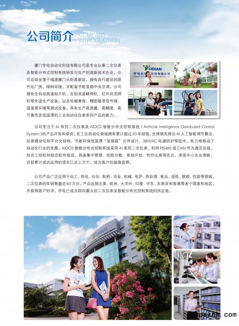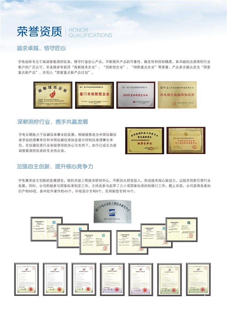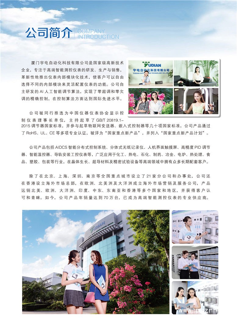 廈門宇電自動化科技有限公司成立于1991年,是專業提供高端節能環保解決方案的高新技術企業。公司總部坐落于福建廈門火炬高新區,擁有自行建設的現代化廠房,綠樹環繞,并配備節能變頻中央空調。公司擁有全自動高速貼片機、無鉛雙波峰焊機、紅外回流焊機等先進生產設備,以及電磁兼容、精密基準信號源、溫濕度環境等測試設備,具有生產高質量、高精度、高可靠性及低溫漂的工業自動化儀表系列產品的能力。經過20多年的發展,公司得到了社會各界的廣泛認可,曾被評選為“福建省著名商標”“廈門市自主創新試點企業”,并榮膺“2012年度中國自動化領域年度十大企業”、其自主研發的多種產品更是榮獲“國家重點新產品”、“廈門市優秀新產品獎”等稱號。