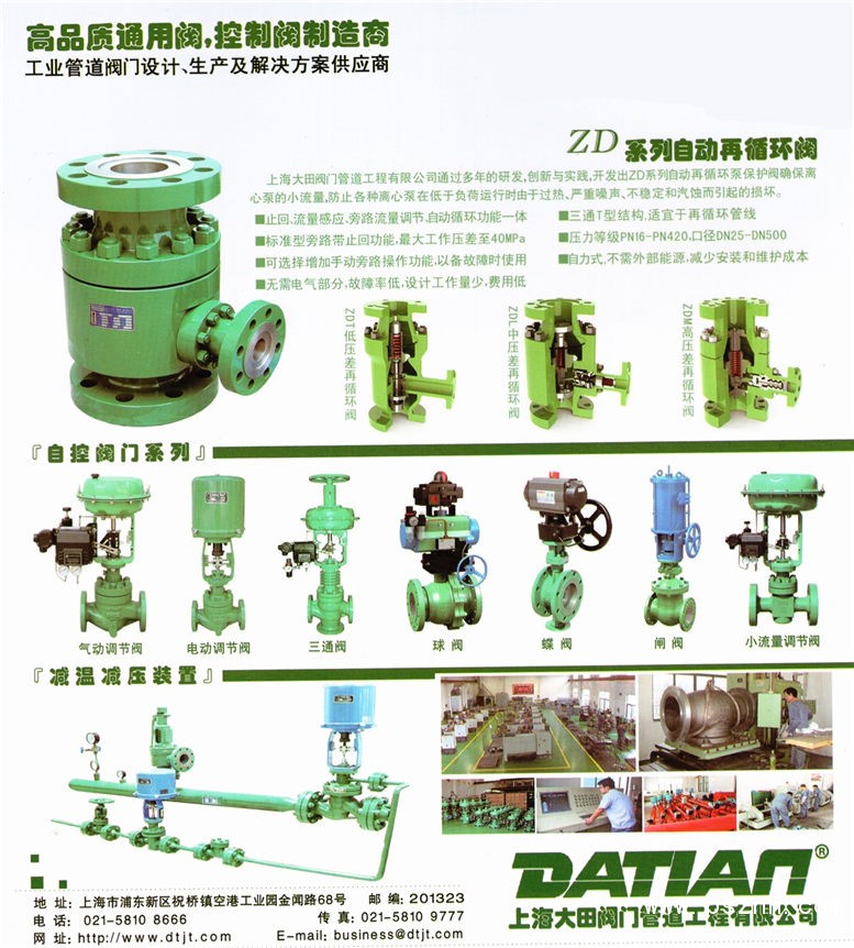 公司現在生產的產品有調節閥及附件、通用閥門、減溫減壓裝置、自動再循環控制閥、電磁閥、API6A閥門等。調節閥及附件包含有:氣動調節閥、 電動調節閥、自力式調節閥、手動調節閥、氣動薄膜執行機構、電動執行機構、電氣閥門定位器、電動閥門調節模塊等。通用閥門包含有:閘閥、截止閥、球閥、蝶閥、止回閥、水力控制閥、柱塞閥、旋塞閥、隔膜閥、安全閥、減壓閥、疏水閥、排氣閥、平衡閥、針型閥及多種襯里閥門等。減溫減壓裝置分為低壓、中壓、次高壓、高壓四種規格。自動再循環控制閥分為低壓、中壓、高壓三種規格。電磁閥包含有:水用電磁閥、蒸汽電磁閥、煤氣電磁閥、空氣電磁閥、真空電磁閥、高溫電磁閥等。API6A閥門包含有閘閥、節流閥等。同時,公司可按照客戶的要求進行非標產品的設計、制造、加工。