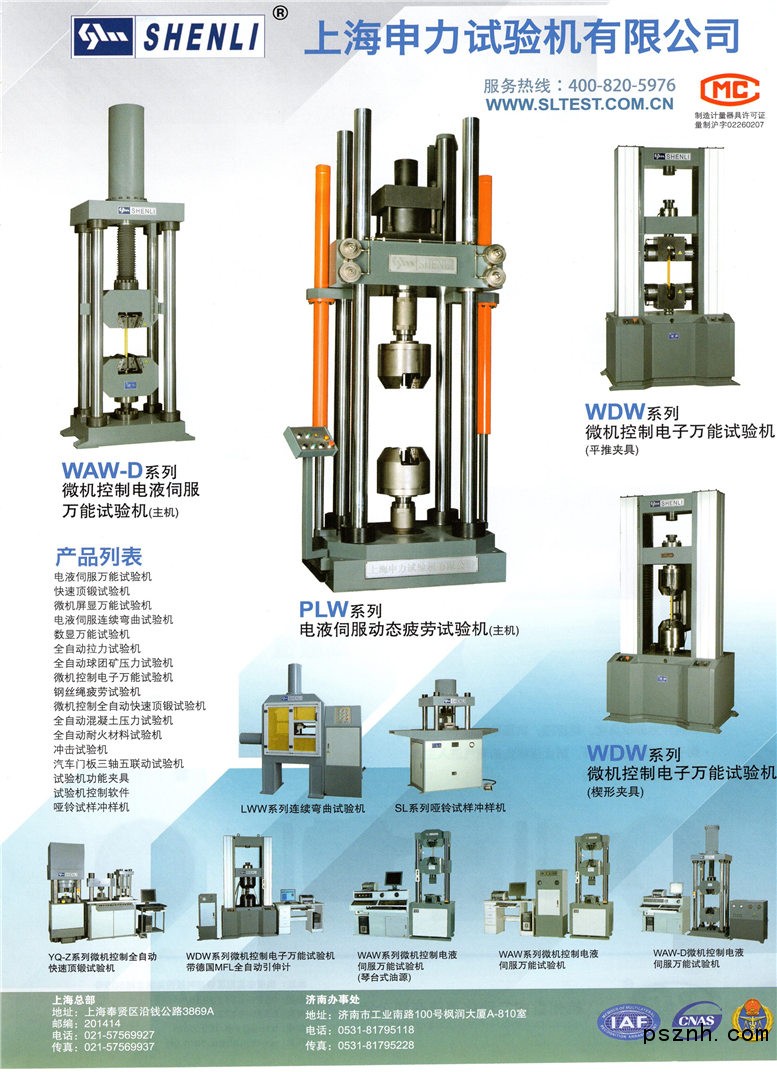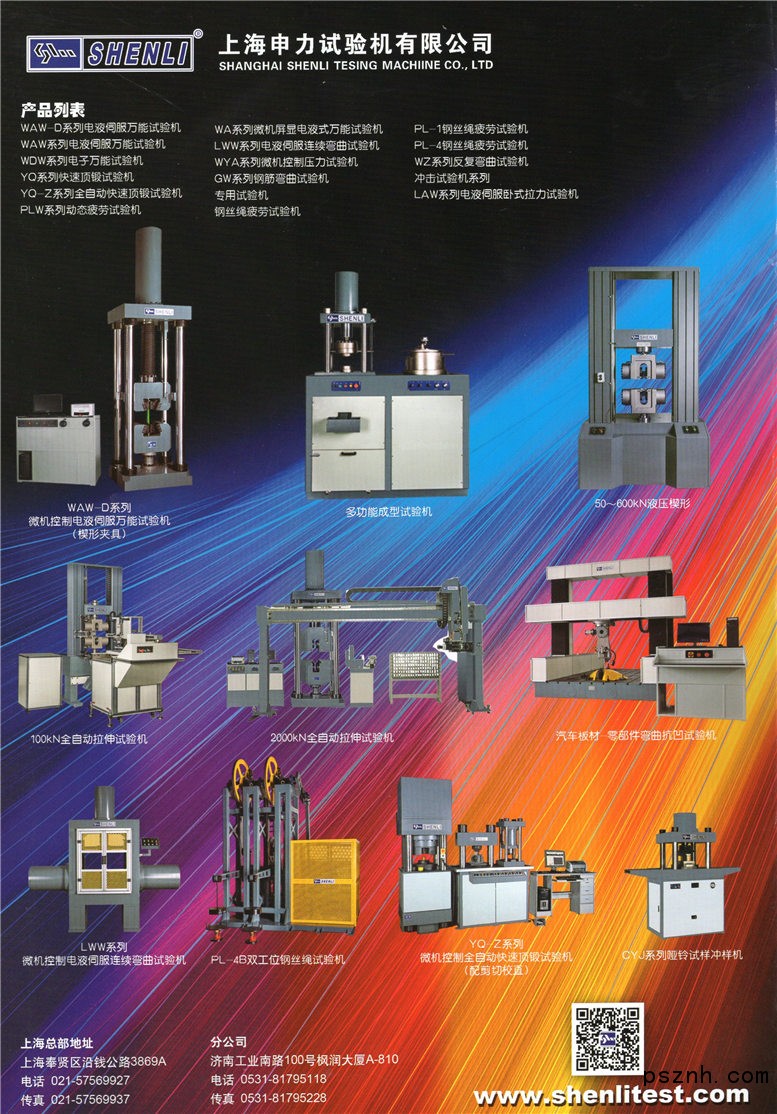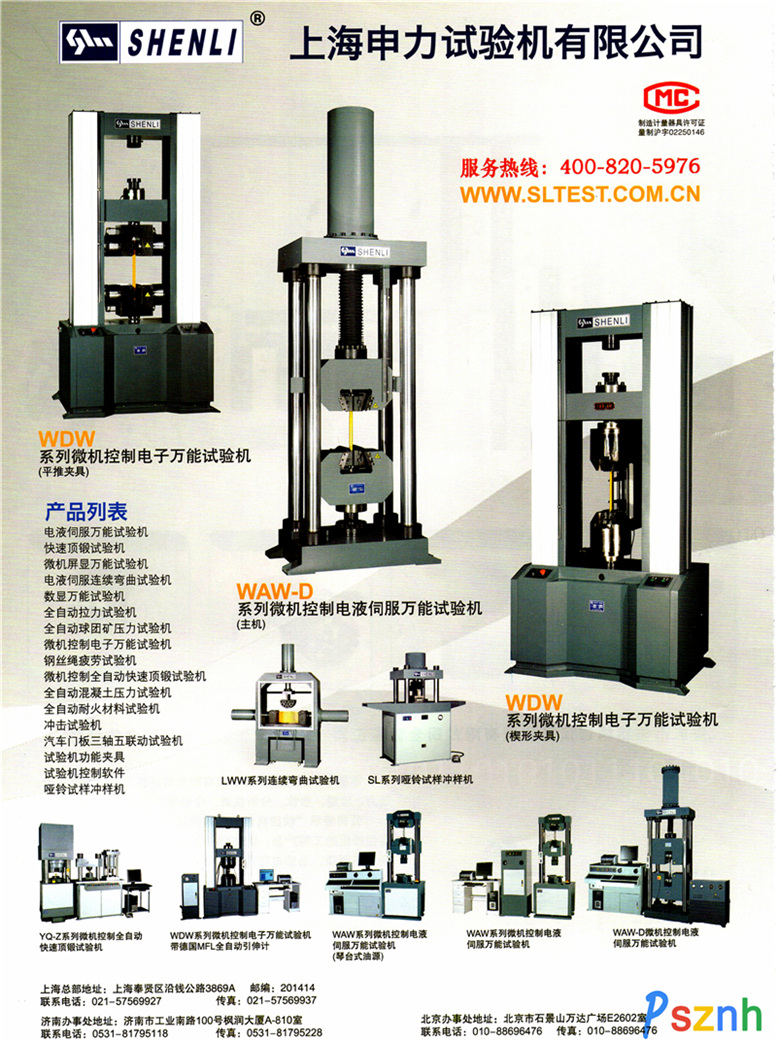 我公司總經理楊浩源原是濟南試驗機廠技術專家、高級工程師,國內首家引進電液伺服萬能試驗機和微機控制電子萬能試驗機的主管工程師;總工程師張靜淵原是濟南試驗機廠的廠長,獲國家銀質獎章的60噸萬能試驗機總設計師。在前輩的帶領下,年輕的工程技術人員迅速成長,并將最新的電子技術和微機控制成果應用到試驗機的研制和生產,不斷推出領先同業的產品,獲得用戶的高度評價。申力產品共有七大系列八十多個品種。其主要產品系列有電液式萬能 試驗機、微機顯示電液式萬能試驗機、微機控制電液伺服萬能試驗機、電液式壓力試驗機、恒應力壓力試驗機、微機控制電子萬能試驗機等,并可按照客戶要求設計非標試驗機、訂購專用試驗機附件,對老式試驗機產品進行更新技術改造。
